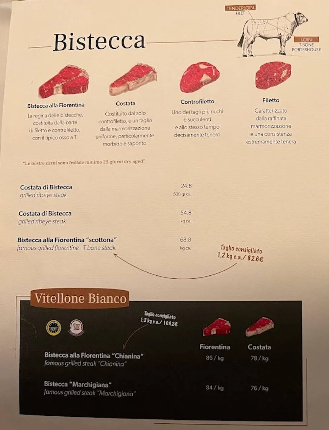 티본 스테이크를 맛보고 싶다면 Bistecca alla Fiorentina 뒤에 붙은 단어를 잘 보고 고르면 됩니다. 가격이 비싸더라도 최고의 티본 스테이크를 맛보고 싶다면 “키아니나 Chianina”를, 가성비를 우선 순위에 둔다면 “스코토나 Scottona”를 선택하면 됩니다. * ’스코토나’는 다른 품종의 소지만 16개월 이상 22개월 미만의 출산을 하지 않은 암소를 사용해 키아니나 못지않게 맛있습니다.