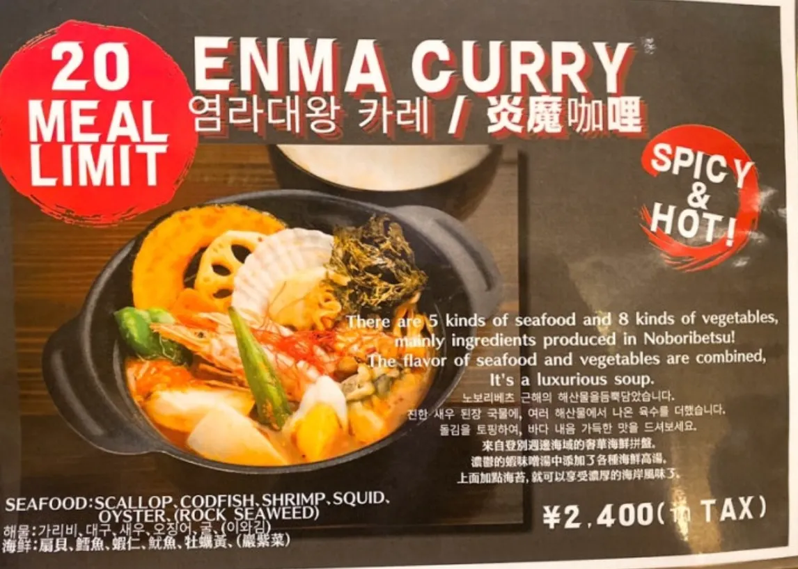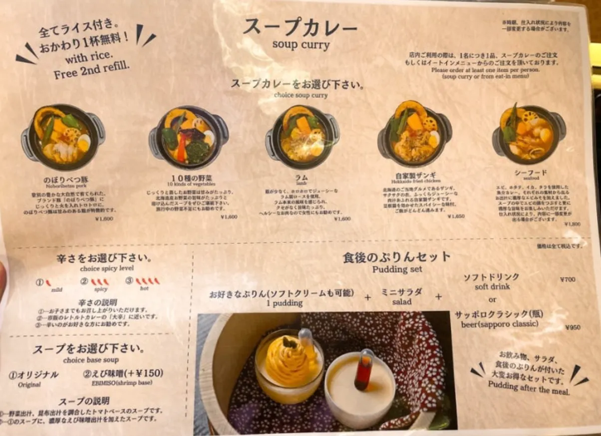 염라대왕 카레스프, 노보리베츠산 돼지고기로 만든 돼지고기 카레스프, 양고기 카레스프, 해산물 카레스프, 가라아게(튀긴 치킨)카레스프, 야채 카레스프 등이 있어요.