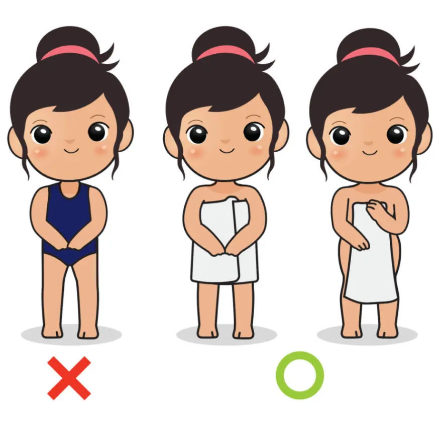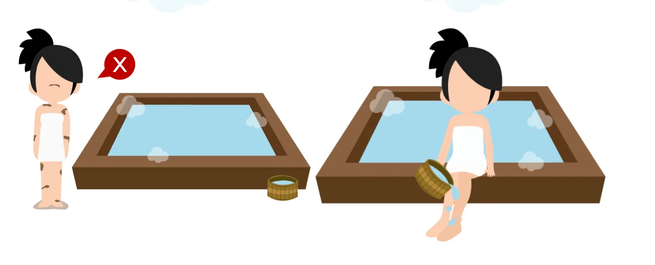 일본은 탕 안에 수건을 갖고 들어가지 않습니다. 작은 수건은 가지고 갈 수 있지만 이동할 때 몸을 가리는 용도입니다. 이는 수건이 물에 닿을 경우 물이 더러워지는 것을 예방하기 위함이에요. 수건 뿐만 아니라 머리카락도 물에 들어가지 않도록 단정히 묶는 것이 좋아요. 수영복이나 속옷을 입고 입욕하는 것도 매너 위반입니다!
