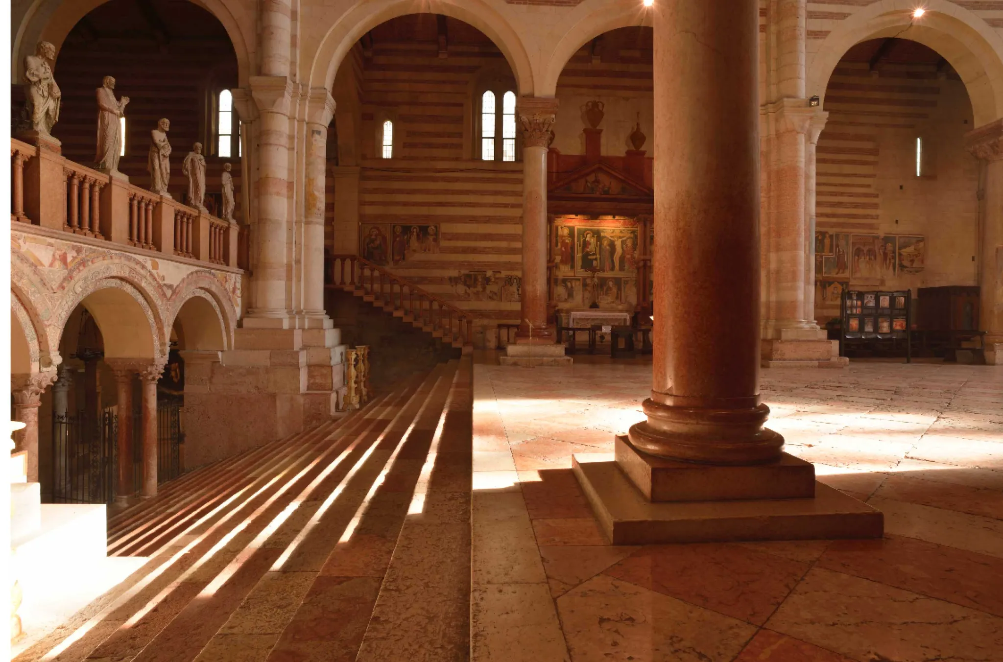 베로나 대성당은 과거 지진으로 무너진 두 개의 성당 위에 로마네스크 양식으로 다시 지어진 성당이에요. 정식 명칭은 ‘성모 승천 대성당’으로, 지금도 옛 성당의 흔적을 찾을 수 있답니다. 약 50년 전에는 성당 중앙 바닥에서 4세기 이전의 것으로 추정되는 최초 성당의 모자이크 장식을 발견했다고 해요.