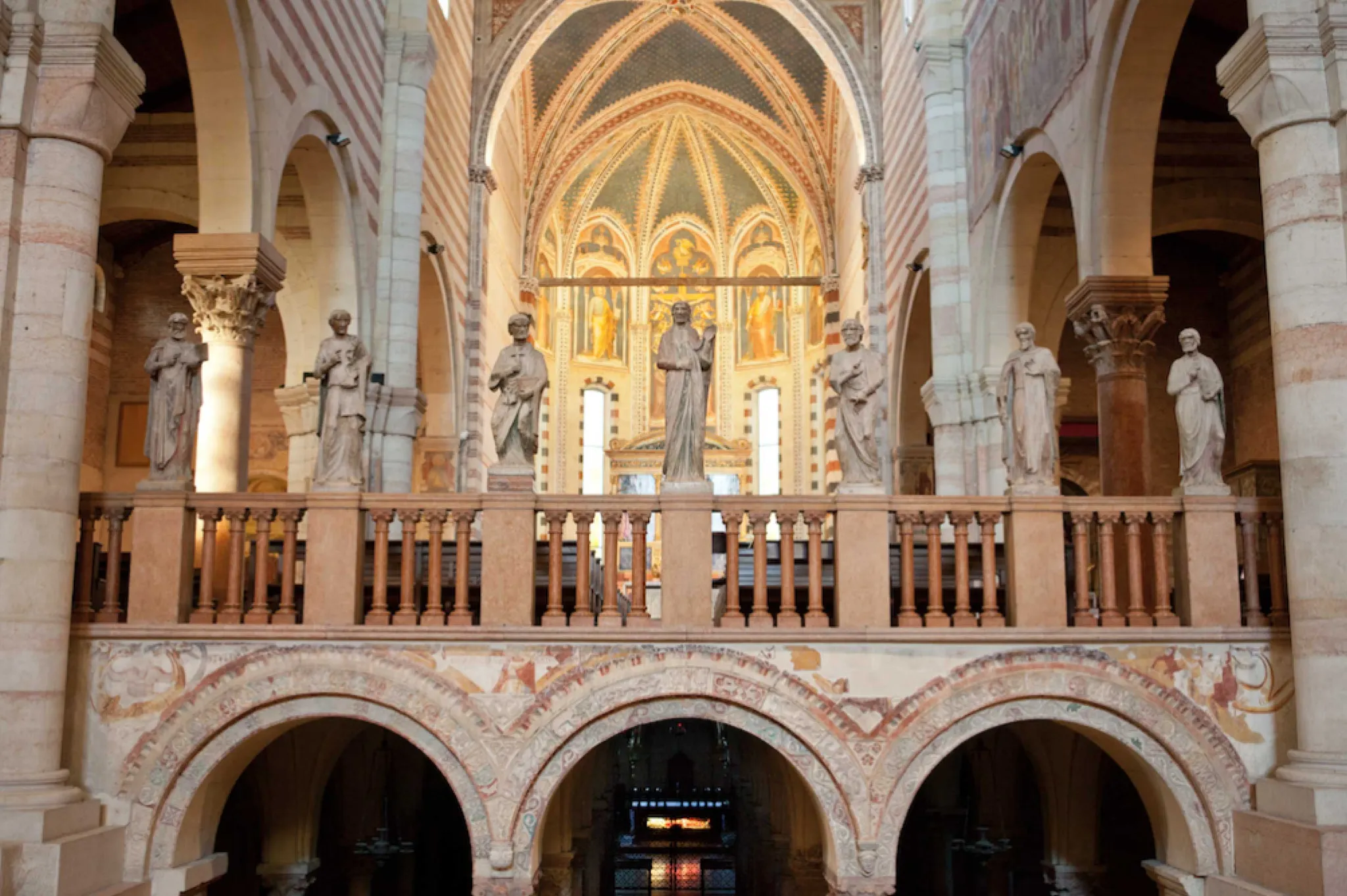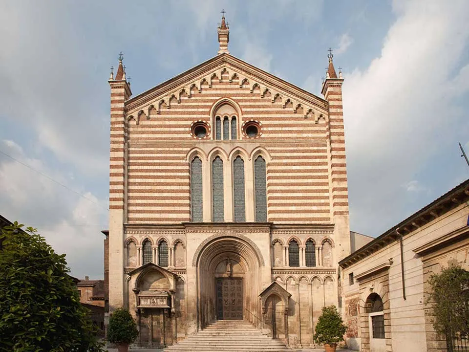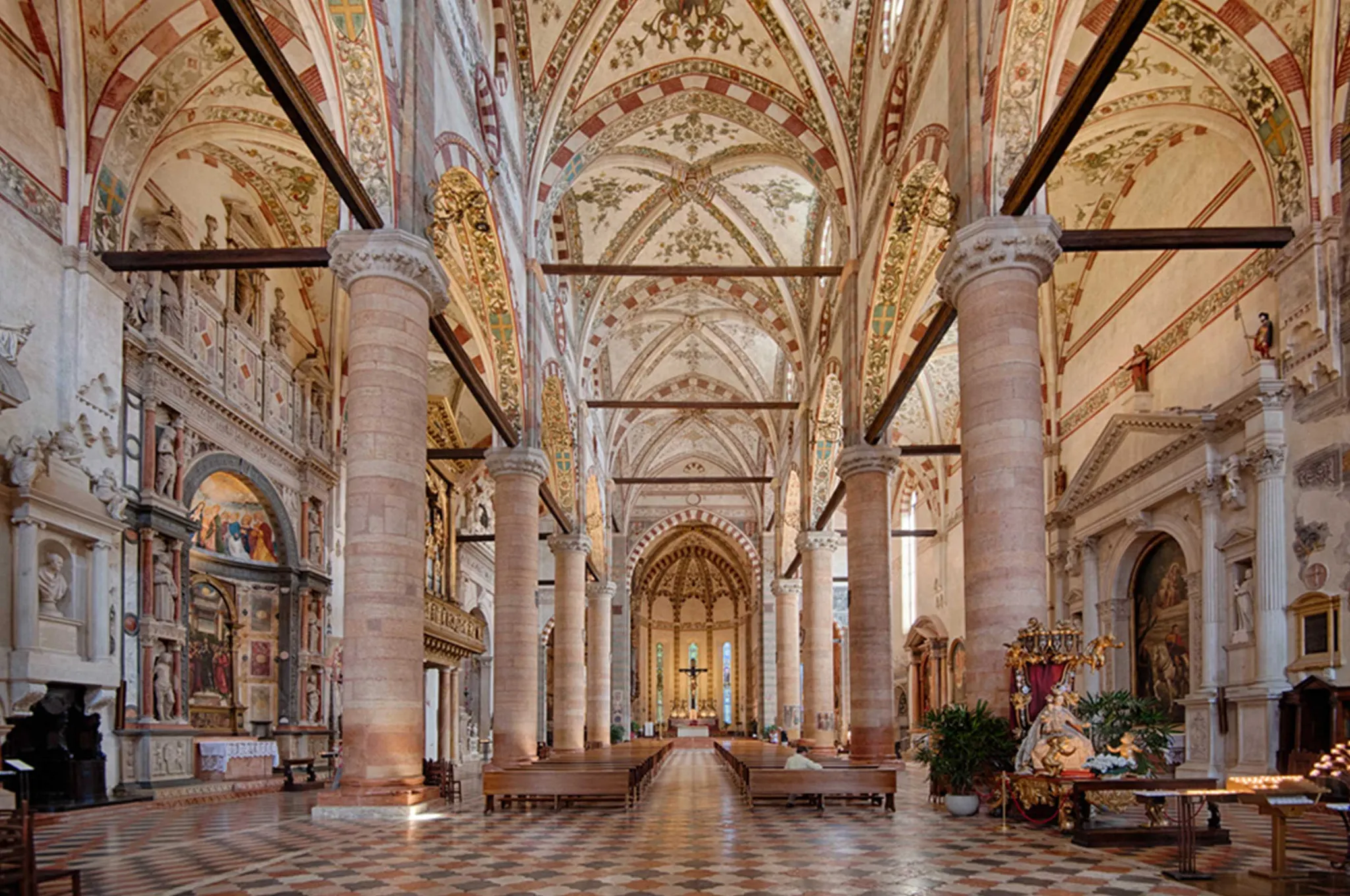 베로나에서 생산되는 붉은 대리석으로 지어진 로마네스크 양식의 베로나 대성당입니다. 1187년 완공되었지만 계속해서 증축하고 있는 성당으로, 담백한 외관과는 달리 실내는 붉은 베로나 대리석 기둥이 특징으로, 웅장하고 화려하게 장식된 성당입니다.