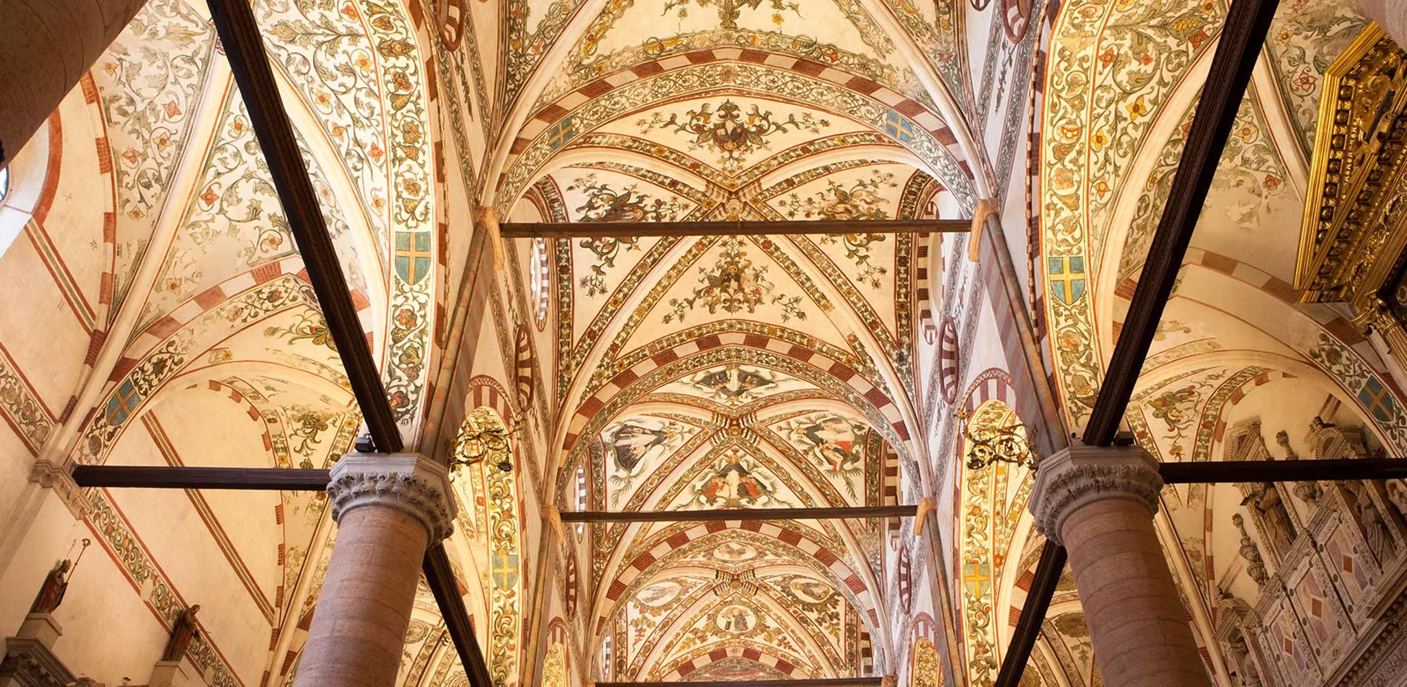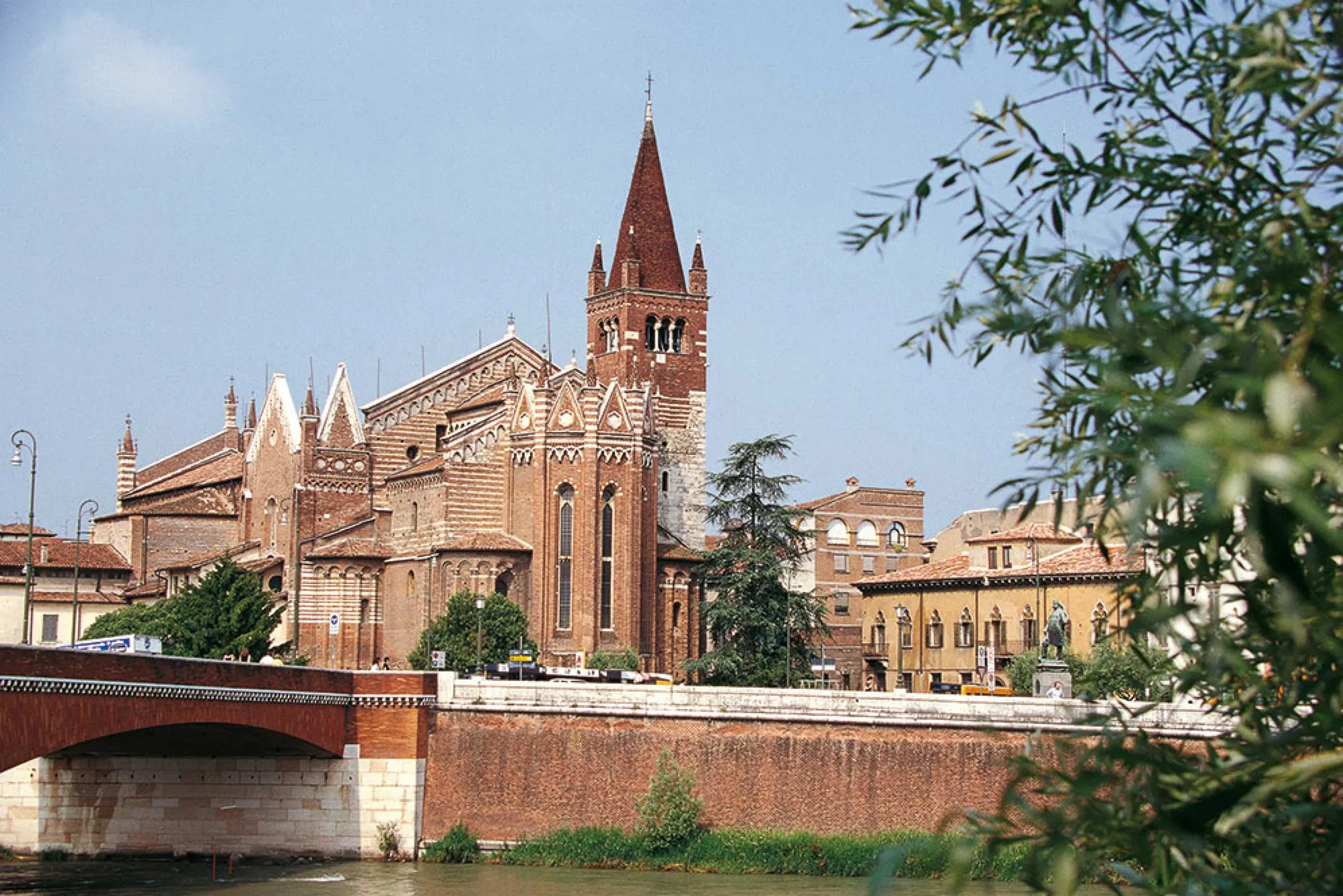 산타 아나스타시아 성당은 베로나에서 가장 큰 성당입니다. 4세기 순교자 아나스타샤 성녀에게 헌정된 성당으로 고딕양식으로 지어졌어요. 보르사리 다리와 옛 포스투미오 다리를 연결하는 베로나의 주요 로마 도로인 데쿠마누스 막시무스 끝에 위치해 있기 때문에 베로나에서 가장 많은 방문객이 모이는 곳이기도 해요. 천장의 꽃장식부터 대리석 기둥과 표면의 섬세한 색상에 이르기까지 웅장한 내부 공간이 매력적인 성당입니다.