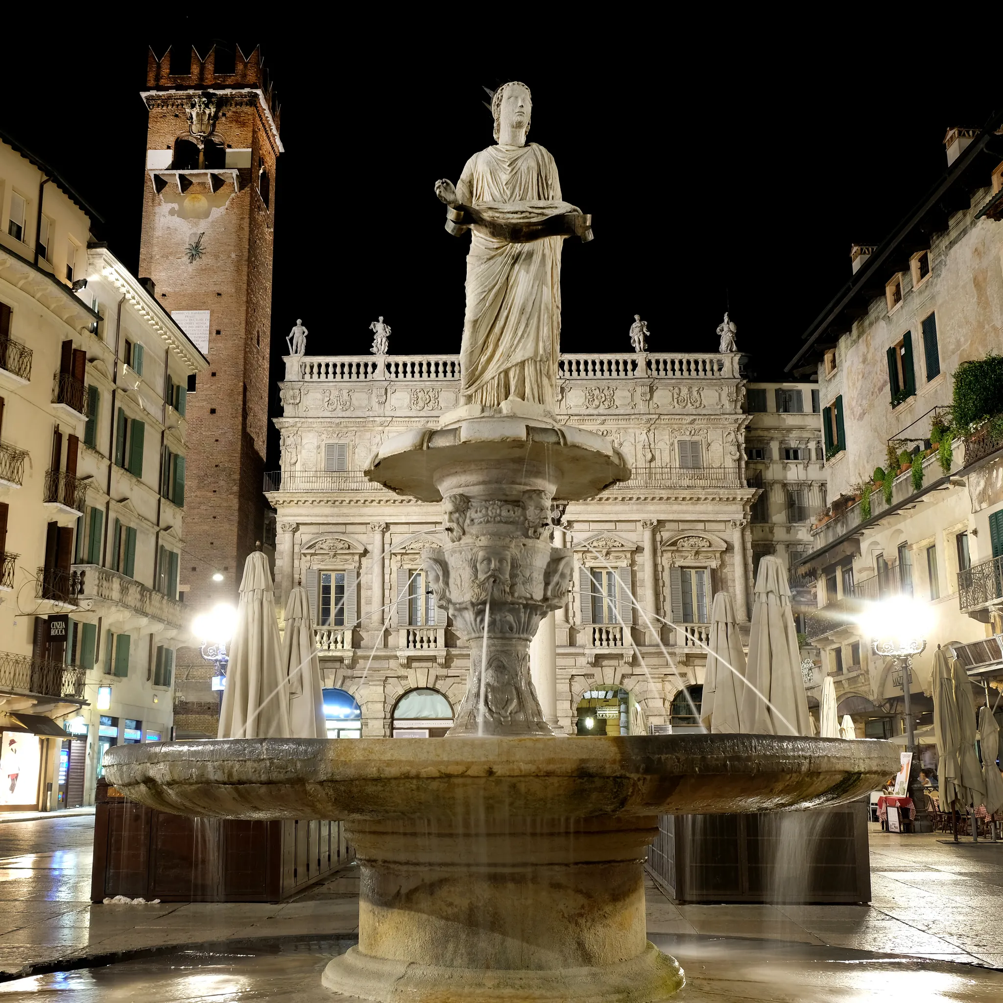 광장 중앙에는 광장에서 가장 오래된 조각상인 폰타나 마돈나 베로나(베로나의 성모 마리아 분수)가 있어요. 분수대는 14세기 만들어졌지만, 성모 마리아 조각상은 무려 4세기에 만들어졌다고 합니다. 광장 북쪽으로는 베로나에서 가장 높은 탑인 람베르티 탑과 재판소가 있답니다.