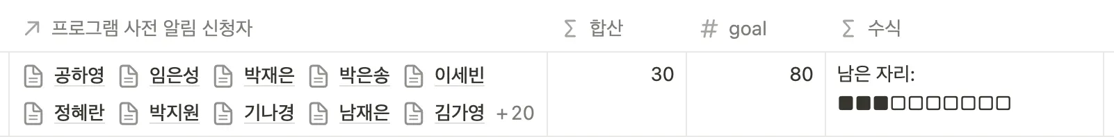 if((prop("합산") / prop("goal")) >= 1, "✅", "남은 자리: "+(((substring("■■■■■■■■■■", 0, floor((prop("합산") / prop("goal")) * 10)) + substring("□□□□□□□□□□", 0, ceil(10 - ((prop("합산") / prop("goal")) * 10)))) + " ")))