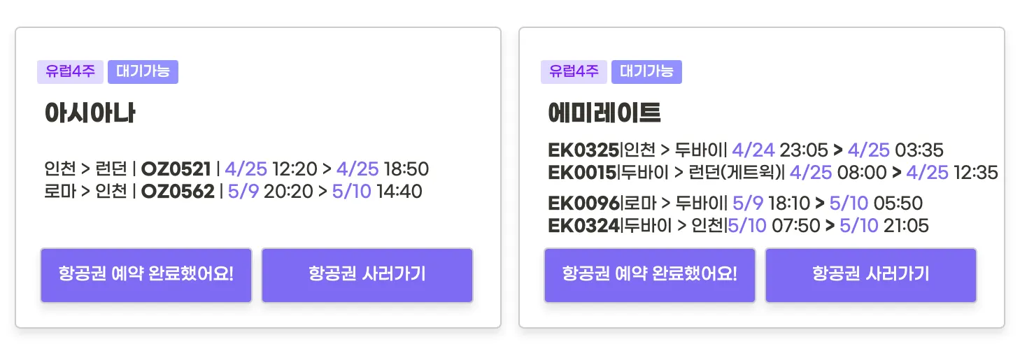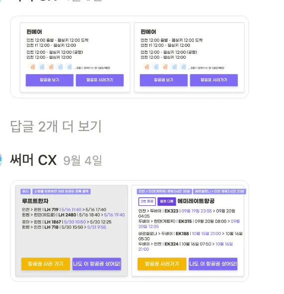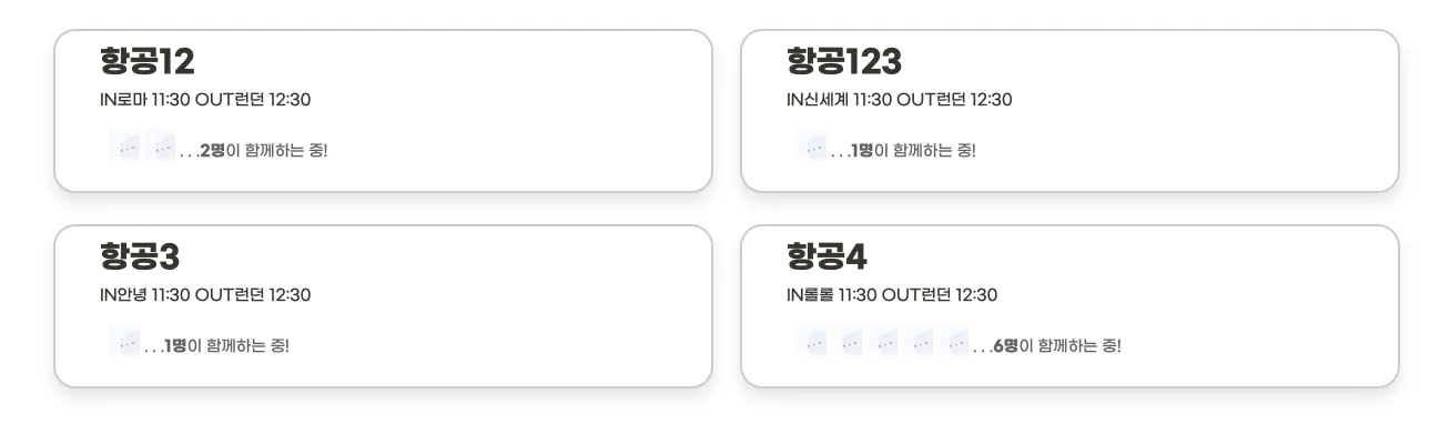 아래 카드들 중 함께 타고 싶은 [항공권 사러가기] 링크를 클릭 후 일정을 꼭! 확인하고 예약 해주세요!