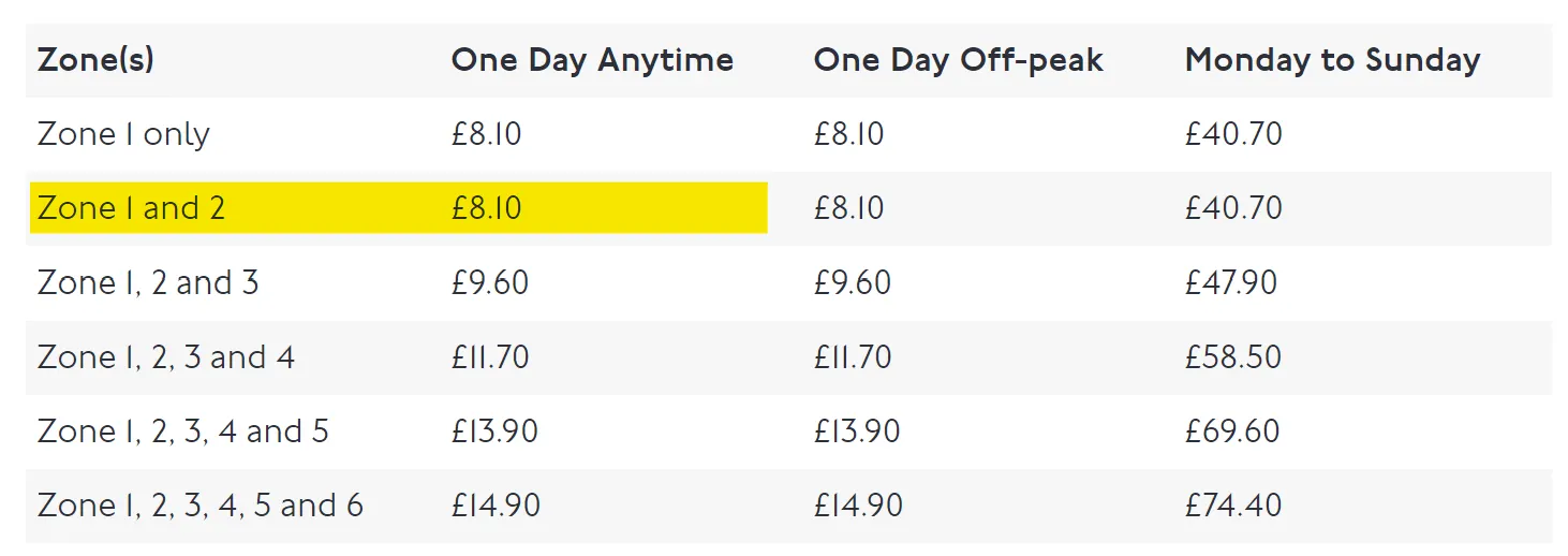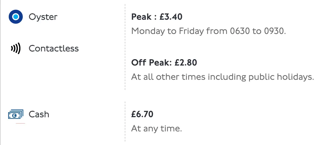 * 1-2존 오프피크타임 1회 탑승시 £2.80 * 1-2존 피크타임 1회 탑승시 £3.40