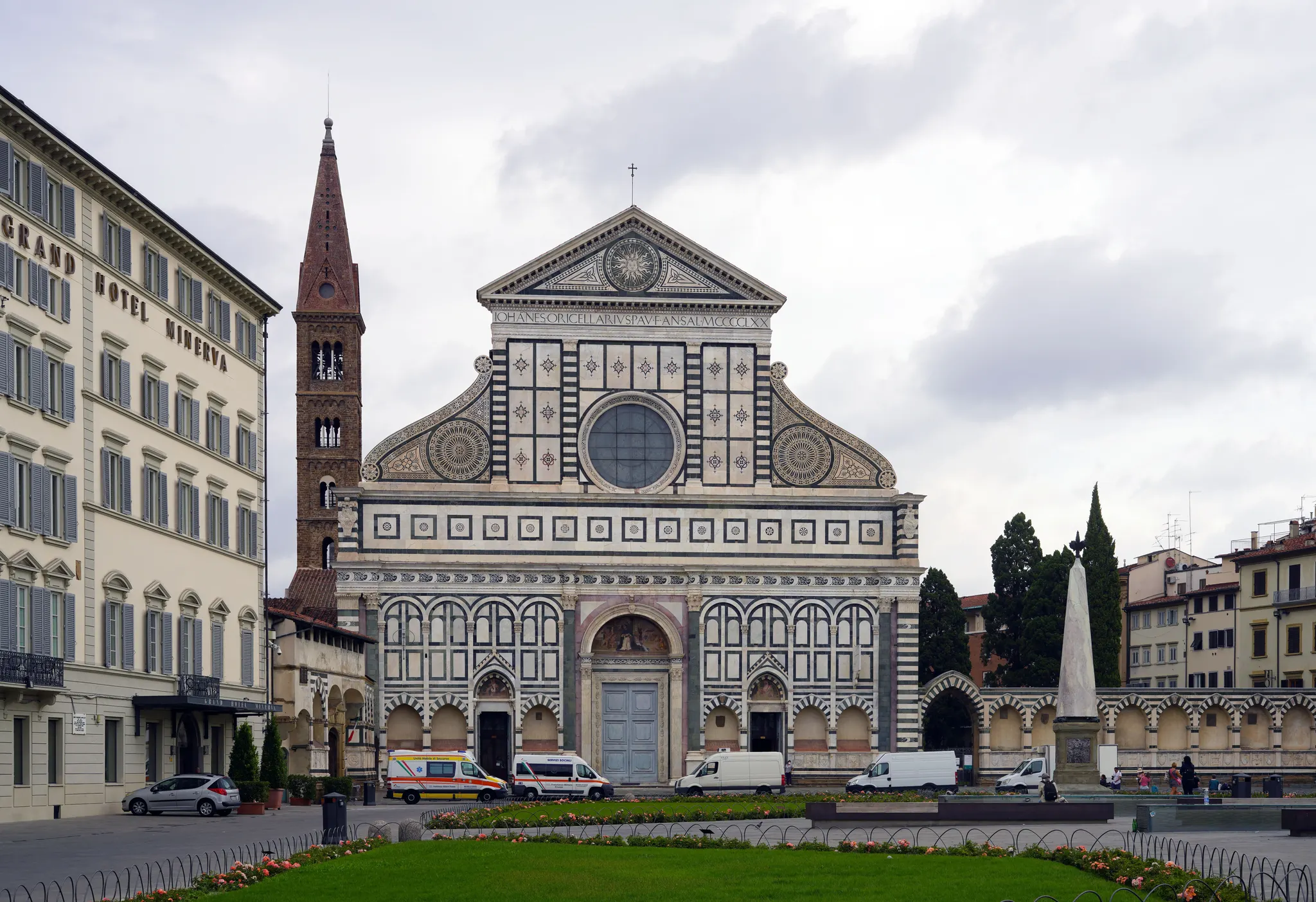 피렌체에서 가장 유명한 성당은 아마 ‘산타 마리아 델 피오레(두오모 성당)’일 거예요. 하지만 피렌체 중앙역의 이름은 이 성당의 이름인 ‘산타 마리아 노벨라’랍니다. 그만큼 피렌체에서 역사적으로 중요한 의미를 가지고 있는 성당이에요! 외관은 산타 크로체 성당과 비슷하게 생겼고, 내부에 고딕 미술과 초기 르네상스 미술의 거장들이 제작한 프레스코화가 있죠. 건축 당시 피렌체의 가장 주요한 가문들로부터 자금을 지원받았고, 후원자들은 그 대가로 이곳에서 장례를 치를 수 있도록 보장받았다고 해요.