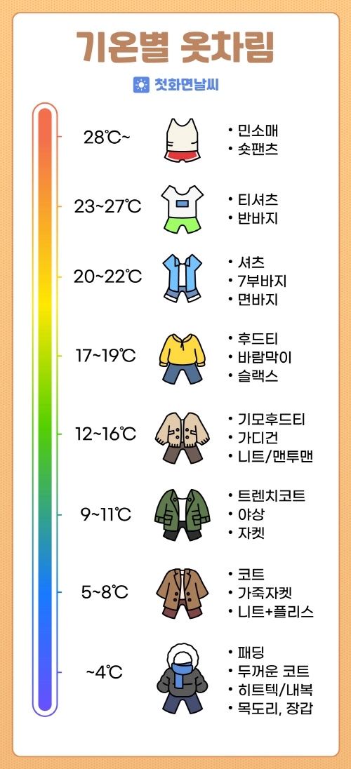 기온별 옷차림 참고! 비 올 때를 대비해 우산이나 우비도 챙겨주세요!