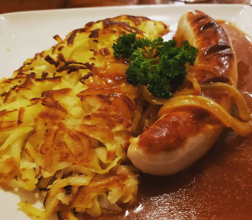 OLMA KALBSBRATWURST AN ZWEIBELSAUCE MIT Rรถsti