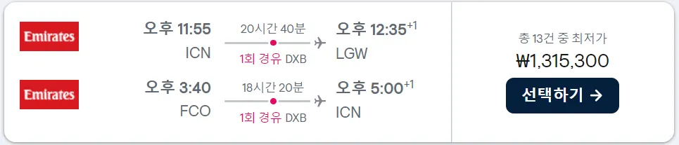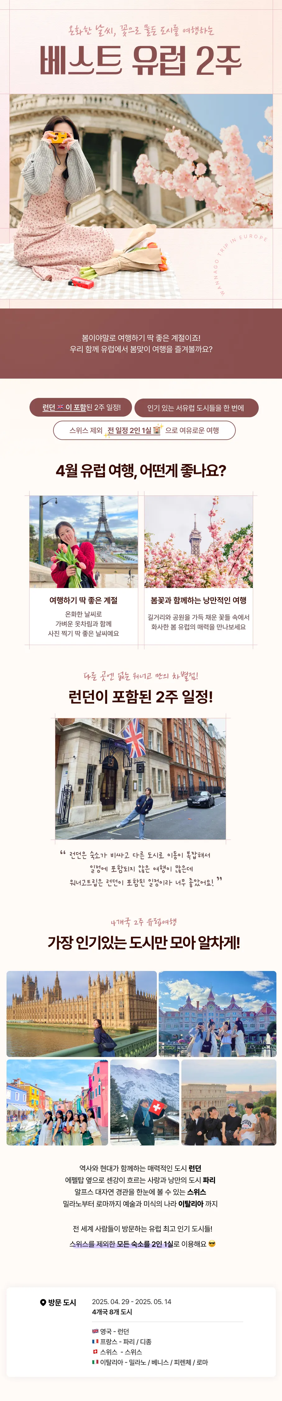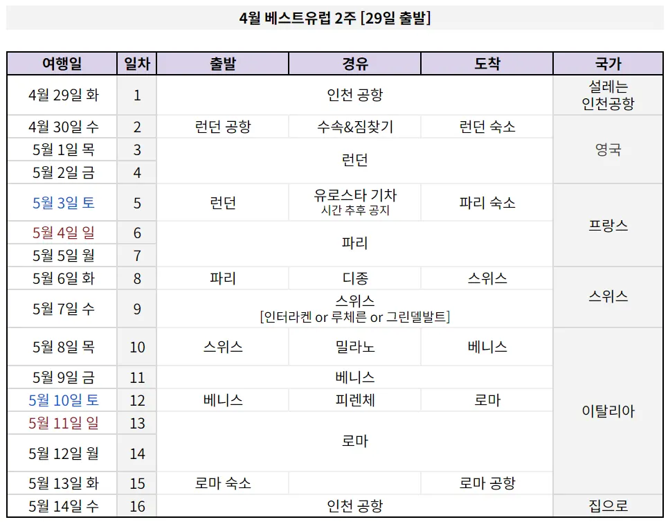 * 프로그램 일정에 맞춰 이동하고 싶다면 [런던에 4/30 도착] [로마에서 5/13 출발] 일정으로 항공권을 예약해주세요.