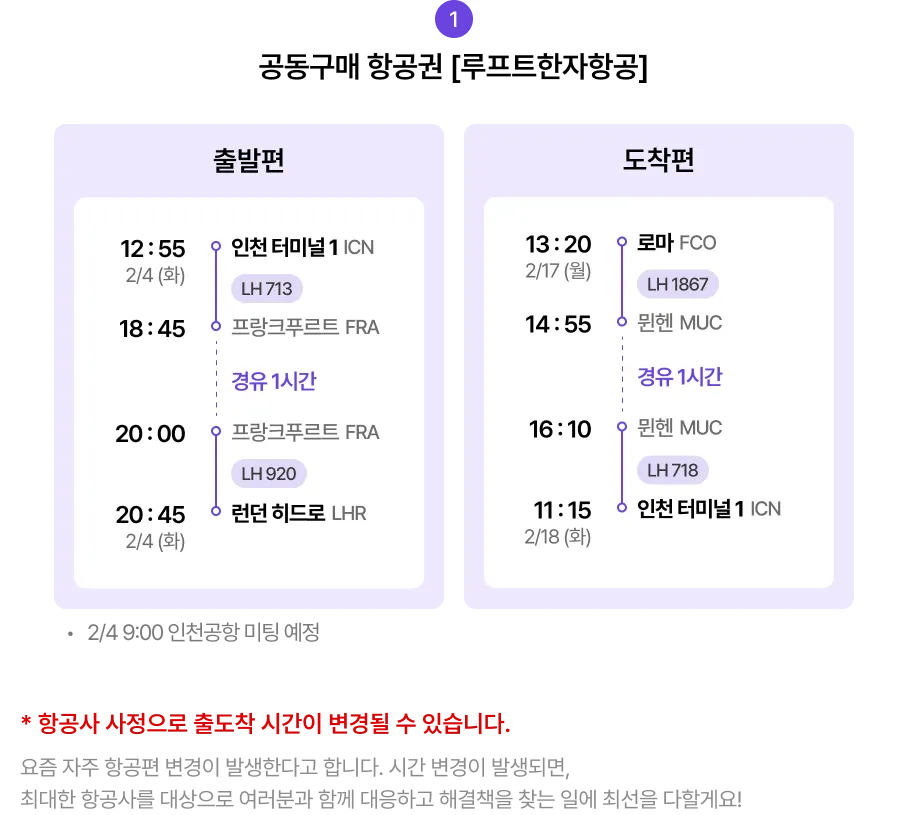 공동구매 항공 이용 시, 2월 4일 낮 12시 55분에 한국을 떠나, 2월 4일 저녁 8시 45분에 런던 공항에 도착하게 됩니다.