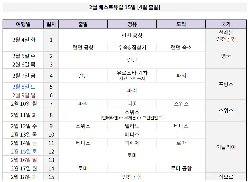 도시 별로 추천하는 일정을 넣어드린 것이니 참고해주세요.