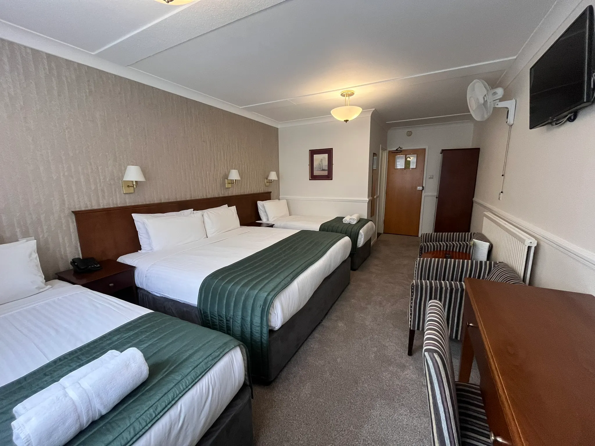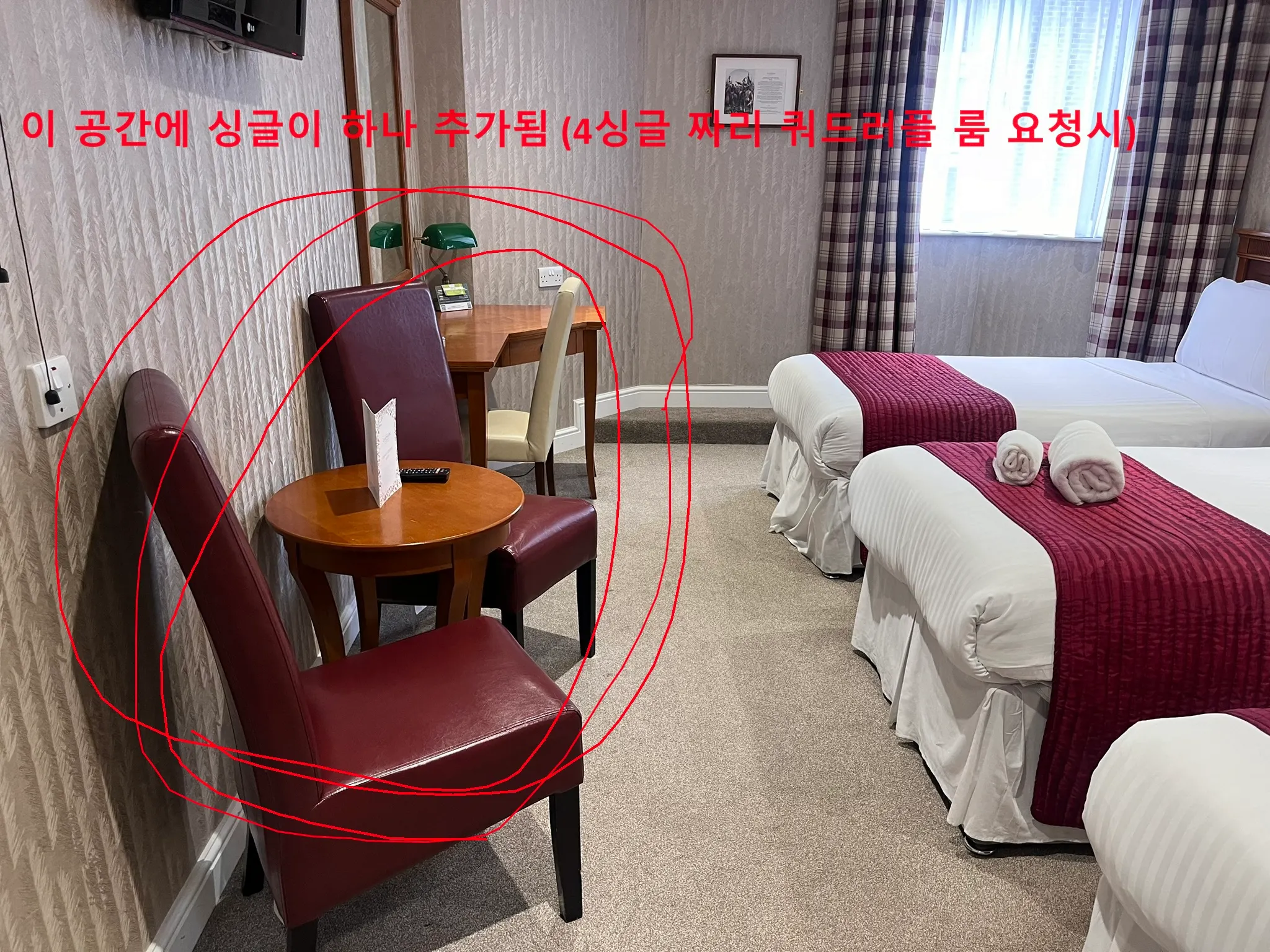 → 기본적으로 존재하는 방은 아니기에 보진 못했습니다만, 싱글 4개짜리 쿼드러플 룸을 요청시 트리플에 싱글 하나를 추가해준다고 합니다. 배치는 온라인에서 보았던 그 구조로, 아래 트리플 룸에서 탁자를 치우고 그 공간에 침대를 넣어준다고 합니다.