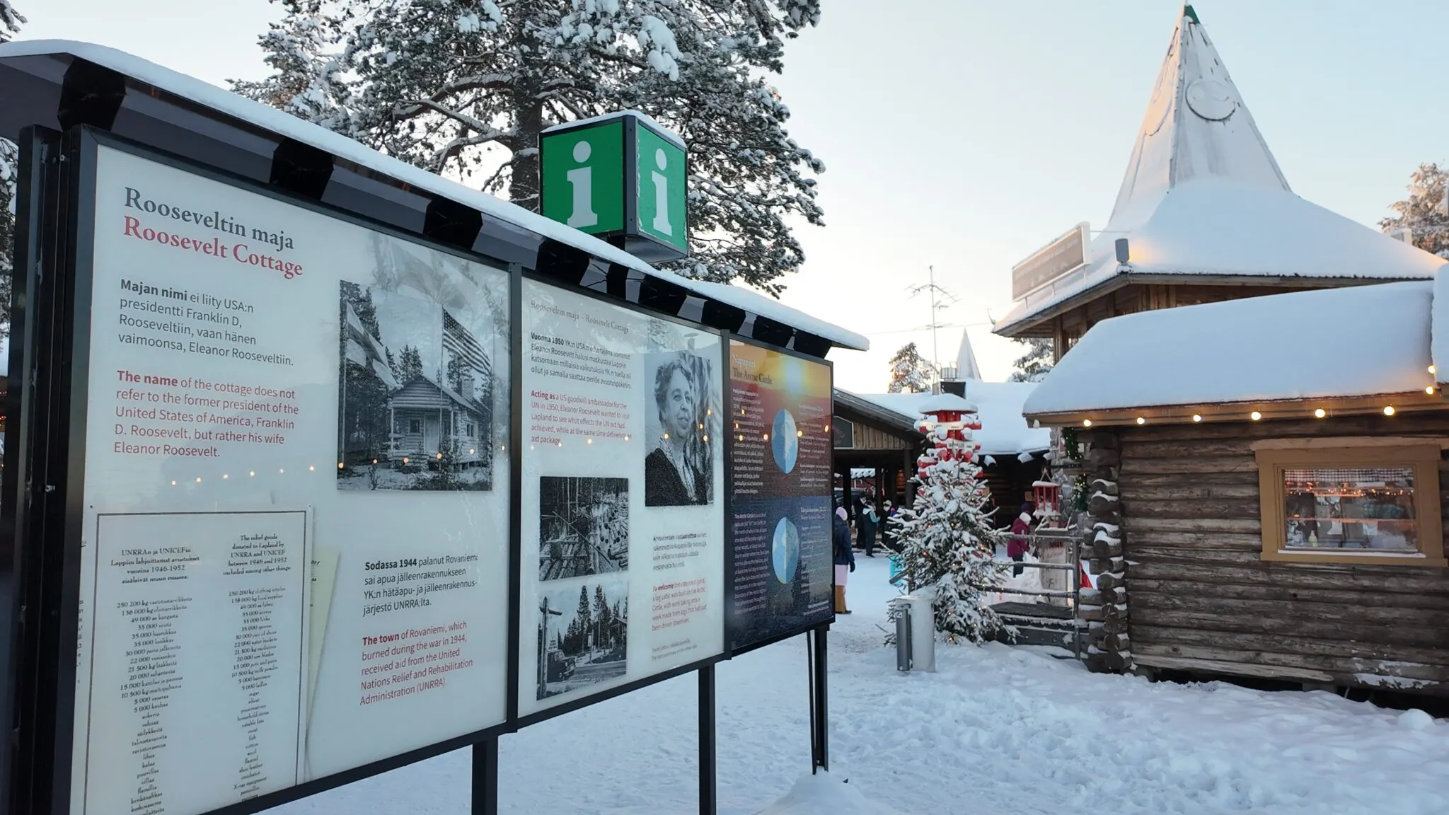 제 2차 세계 대전의 여파로 도시가 파괴된 후 로바니에미는 유니세프의 전신인 UNRRA로부터 복원 지원을 받았고 엘리너 루스벨트는 UNRRA의 친선대사로서, 재건 진행 상황을 확인하기 위해 로바니에미를 방문한 거예요.