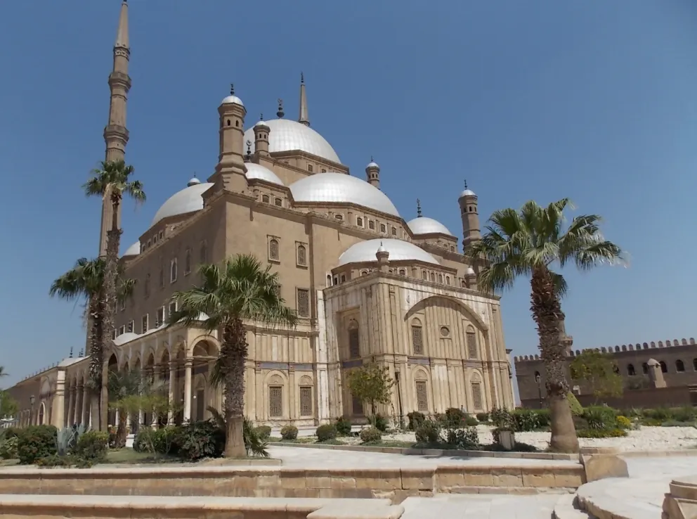 무함마드 알리 모스크는 무함마드 알리(오스만 제국의 이집트 총독으로, 이집트 마지막 왕조인 무함마드 알리 왕조의 창시자)에 의해 건축되었어요. 19세기 무함마드 알리가 이집트 근대화를 시작하면서 ‘근대 국가의 상징으로 남을 건물을 짓자’라고 생각해 만든 모스크로 규모도 크고, 디자인도 웅장하고, 마치 ‘나 여기 있다!’라고 말하는 것처럼 카이로 어디에서든 보일 정도이고, 모스크 외벽을 감싸고 있는 하얀 알라바스터(석고 대리석) 때문에 ‘알라바스터 모스크’ 라고도 불리는데 햇빛 아래에서는 하얗게 빛나고, 저녁에는 노을빛이 반사돼서 금빛처럼 보여요. 모스크 2개의 높은 첨탑과 거대한 돔이 특징이며, 내부에는 많은 등과 샹들리에가 달려 있고, 주위를 둘러인드글라스도 매우 아름다워요. 안뜰의 구석에는 프랑스 정부에서 받은 큰 시계가 놓여 있으며 이것은 무함마드 알리가 프랑스 파리 루브르 박물관 앞에 오벨리스크를 선물하고 프랑스로부터 답례품으로 받은 것인데, 그 오벨리스크는 지금도 파리 콩코르드 광장에 서 있어요.