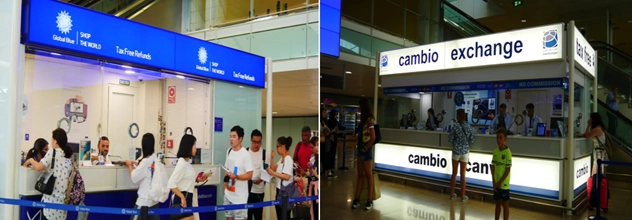 출국심사를 마치고 면세구역으로 가면 터미널 중앙에 택스리펀 환급대행사가 위치하고 있습니다. 대행사는 글로벌 블루 글로벌 블루를 제외한 모든 곳을 취급하는 cambio exchange 오피스가 있습니다.