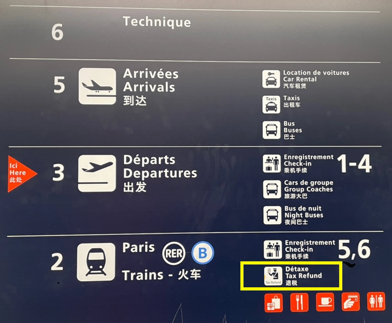 구매한 물건, 택스리펀 서류, 여권, 보딩패스(탑승권), 택스리펀 받을 카드 지참하여 1터미널 2층에 위치한 “Détaxe(Tax Refund)”라고 적힌 이정표를 따라서 이동 *출국층은 3층이니 한 층 아래로 내려가야 해요!