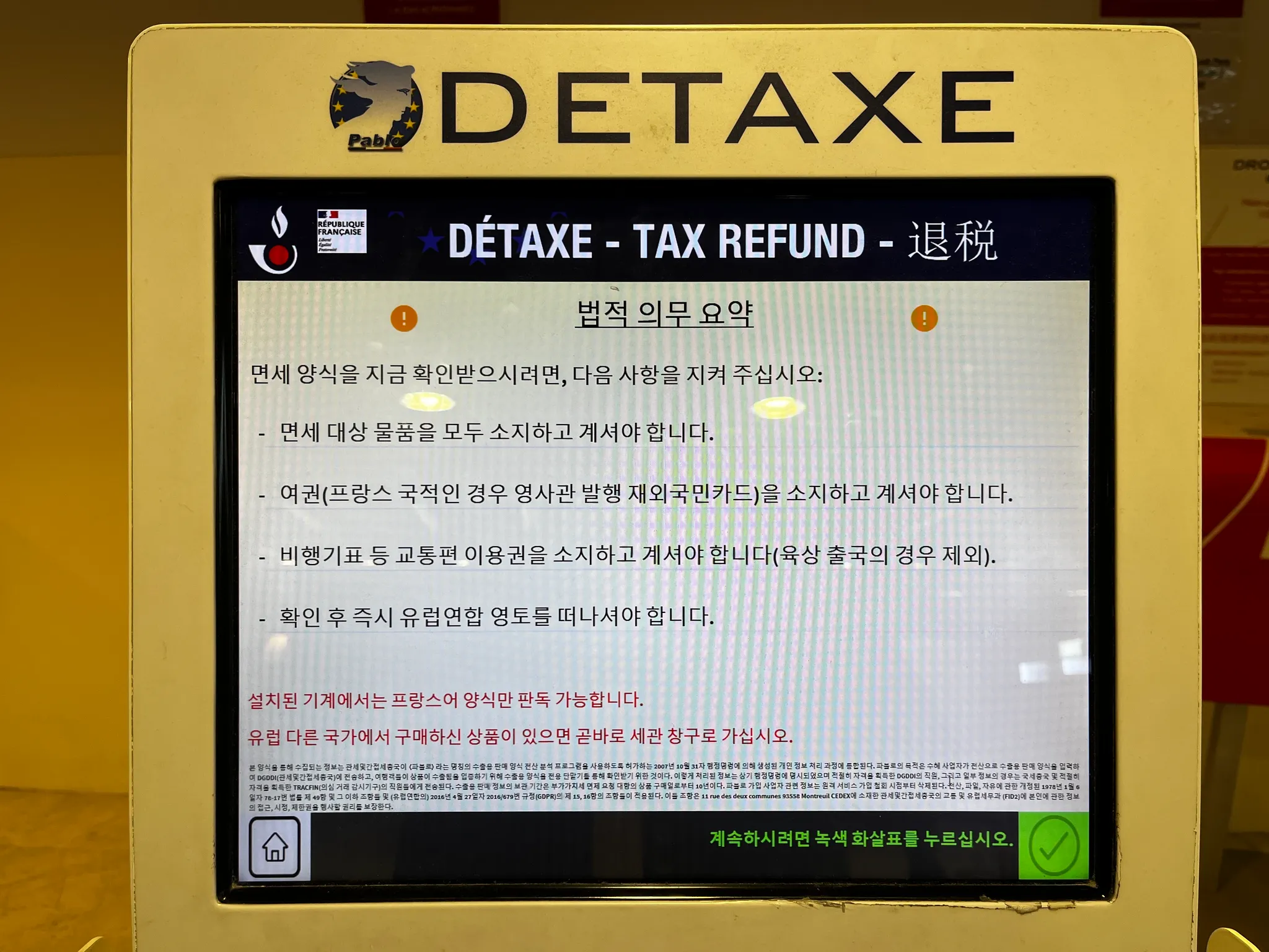 프랑스 이외의 EU국가에서 구매한 물건이거나 키오스크로 처리 불가한 경우