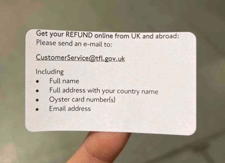 카드 잔액이 £10 이상 → 아래 사진 속 이메일로 (이름 / 집주소 / 거주국가 / 오이스터 카드 번호 / 이메일 주소) 첨부해서 메일 보내면 환불받을 계좌 입력하라는 답신이 옵니다.