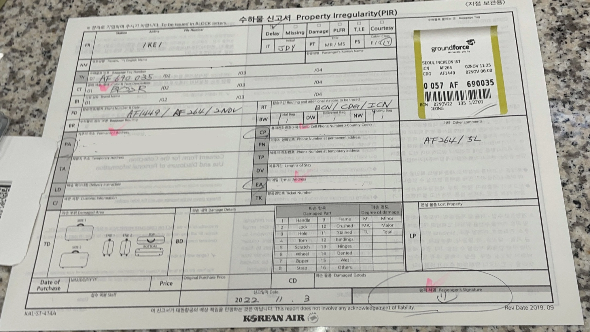 파손 확인 즉시 수하물 수취대 뒤편 분실수하물 안내카운터에 신고