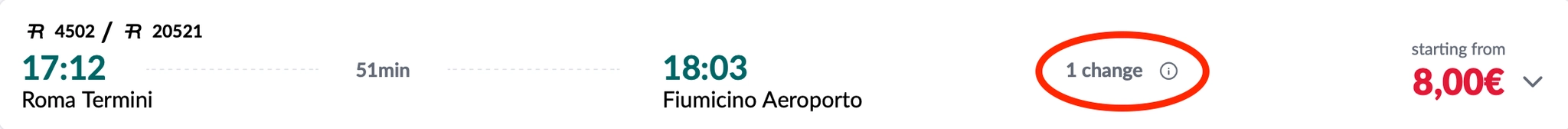 [1 change]가 작성되어 있다면, 중간에 기차에서 내려 다른 기차로 환승이 필요한 기차입니다.
