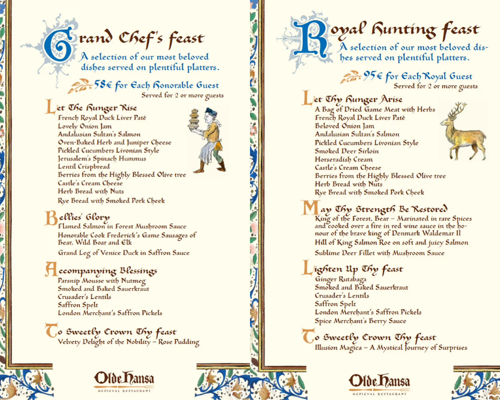 Olde Hansa를 대표하는 메뉴 중 하나인 Hansa Feast는 이름 그대로 “중세 한사 연합의 만찬”을 체험할 수 있는 메인 코스 플래터형 메뉴예요.