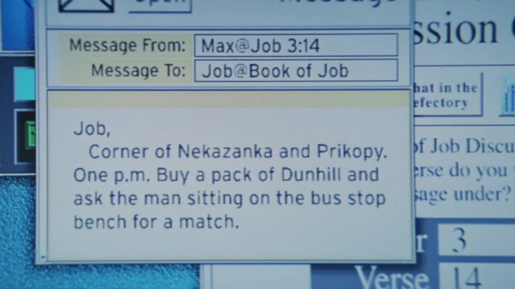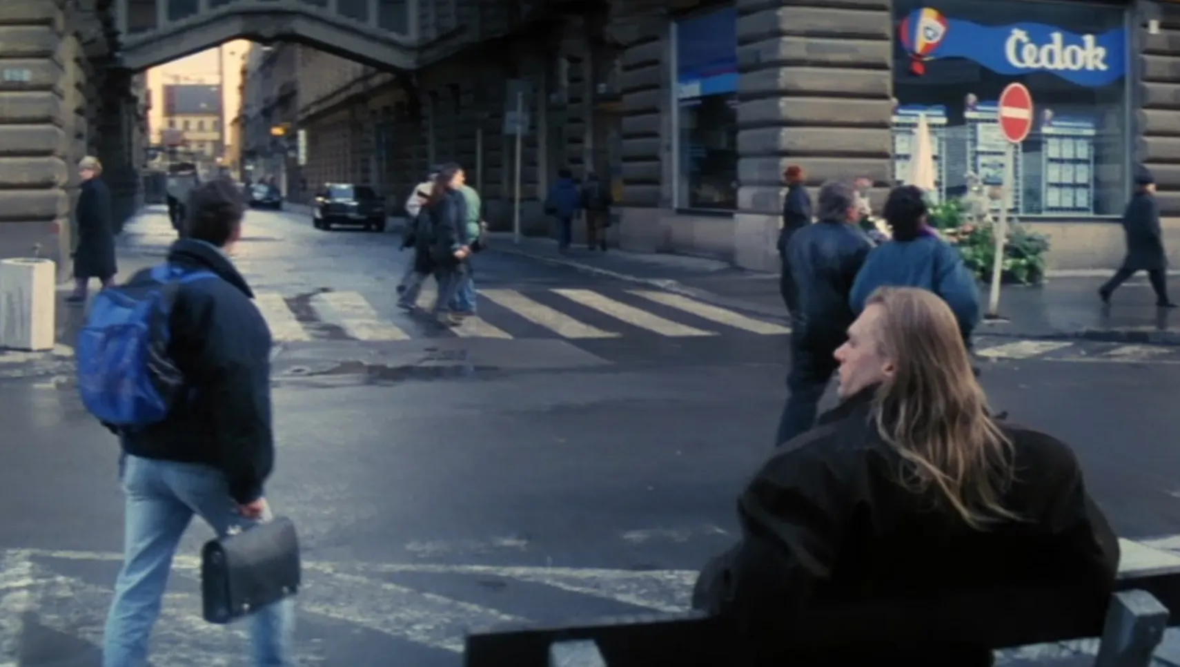 이단은 ‘Nekazanka와 Na Prikopy의 코너’로 오라는 이메일을 받아요. 원래 이 거리 모퉁이에는 버스 정류장이 없었는데, 더 완벽한 장면을 위해 영화 제작자들이 버스 정류장을 만들었죠.
