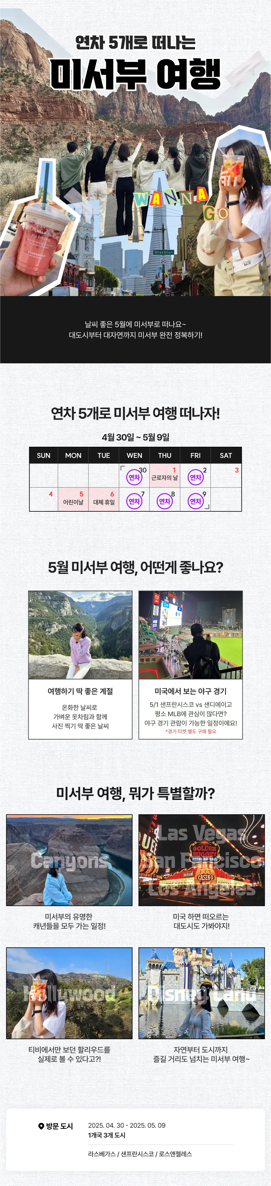 * 프로그램 일정에 맞춰 이동하고 싶다면 [샌프란시스코에 4/30 도착] [로스앤젤레스에서 5/8 출발] 일정으로 항공권을 예약해주세요.
