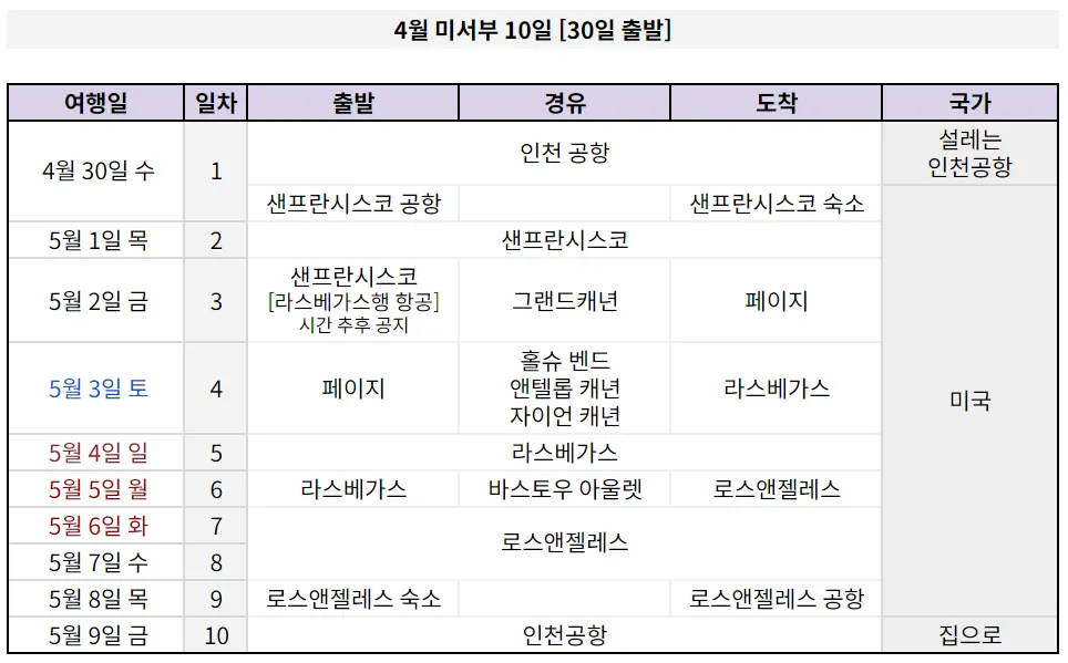 10일 동안 여행하면서 샌프란시스코, 로스엔젤레스, 라스베가스에다가 미서부 유명한 캐년까지?? 여유 있는 듯 바쁜 일정입니다.