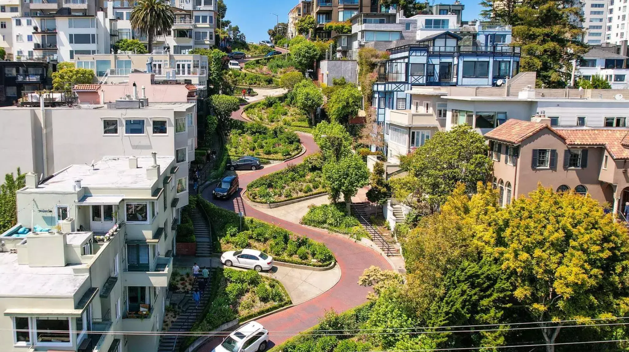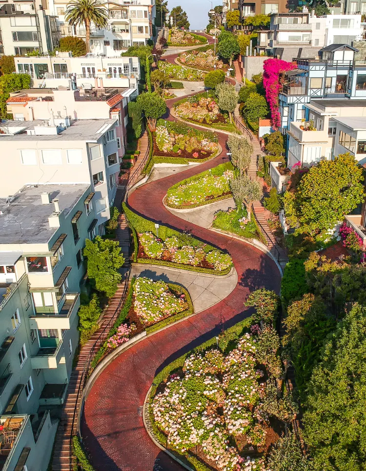 샌프란시스코를 소개하는 사진 속 단골 장소 롬바드 스트리트. 오르막길을 따라 지그재그로 언덕길이 나 있고, 가장자리에는 꽃들이 피어 있어요. 언덕 위를 지나는 케이블카가 이 동화 같은 풍경에 정점을 찍어주죠!