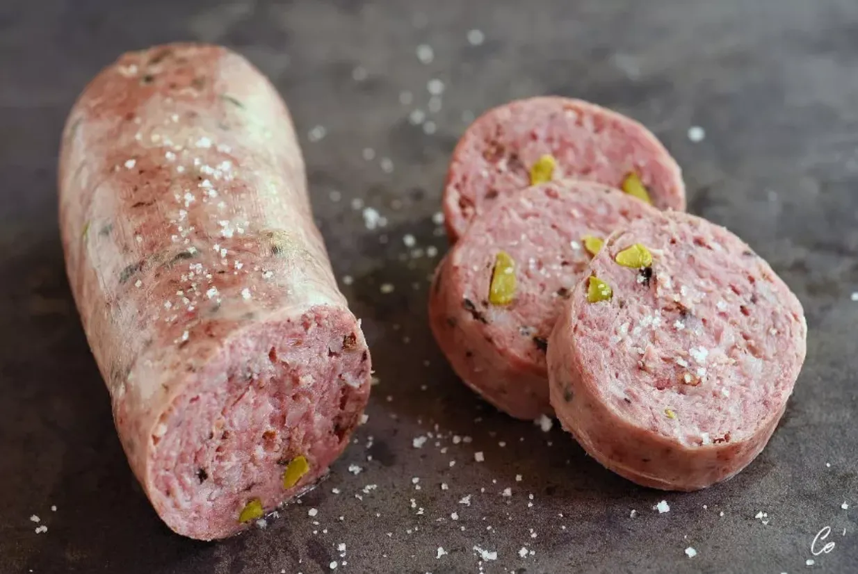 ‘세르블라’ 또는 ‘세르블라 드 리옹’이라는 이름으로 불리는 피스타치오 소시지예요. 소시지(소시송)으로 유명한 리옹 샤퀴테리의 가장 전형적인 소시지 중 하나죠. 피스타치오를 굵게 으깨면 피스타치오 소시지를 조리할 때 향이 맛있게 발산되는데, 그래서 피스타치오가 들어간 소시지는 향과 아삭함이 더해져 그 풍미와 맛이 더 높아진답니다. 그린 샐러드와 함께 먹으면 최고의 에피타이저가 될 거예요!