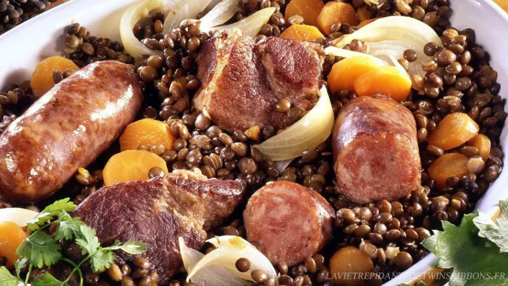 프티 살레(Petit salé)는 야채와 소시지를 넣은 렌틸콩 요리로, ‘쁘띠 살레 오 렌틸(Petit salé aux Lentilles)이 이 음식의 풀네임이에요. ‘조금 짠’이라는 뜻의 ‘프티 살레’는 돼지고기를 더 잘 보존하기 위해 소금에 절이는 샤퀴테리 전통에서 가져온 것인데, 이 ‘프티 살레 오 렌틸’을 만들 때는 고기의 염분을 제거하고 만들기 때문에 ‘조금 짠’이 되는 것이랍니다.