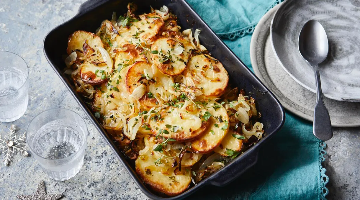 큰 프라이팬에 얇게 썬 양파, 올리브 오일, 버터 절반을 넣고, 양파가 매우 부드러워지고 아직 황금빛 갈색이 되지 않을 때까지 약한 불로 약 30분 정도 조리합니다. 그런 다음 큰 냄비에 소금 물을 끓이고 감자를 3분 정도 삶아줘요. 양파가 익으면 파슬리와 마늘 등 향신료를 넣고 볶아주고, 거기에 삶은 감자를 넣고 버무립니다. 양파와 감자가 잘 버무려지면 모든 재료를 큰 오븐용 그릇에 담아 35분~40분 동안 윗 부분이 바삭바삭해질 때까지 구워내면 간단하지만 맛있는 감자 그라탕 완성!