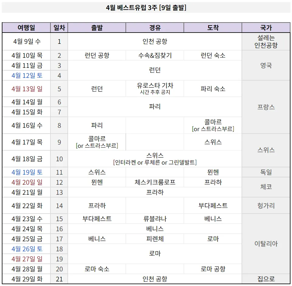 베스트유럽 3주, 한눈에 보기