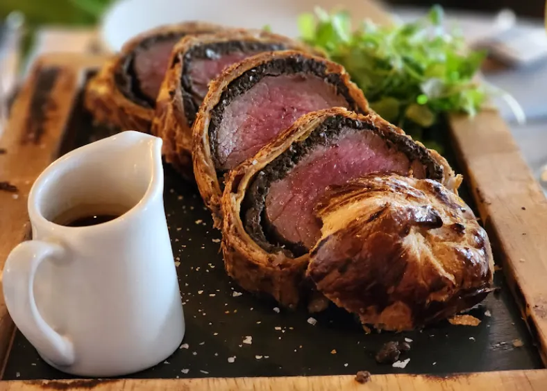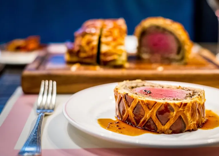 영국의 전통 요리인 비프 웰링턴은 소고기에서 가장 부드러운 부위인 안심 부분을 뒥셀과 퍼프 페이스트리로 감싸 오븐에 구운 음식으로, 레드 와인 소스와 곁들여 먹는 것이 일반적입니다. 소고기를 살짝 익혀 다시 반죽으로 감싼 뒤 오븐에 또 한 번 구워내야 하는 번거로운 조리 과정을 거쳐야 하는 만큼 과거 영국에서는 축하할 일이 있을 때 주로 먹는 음식이었답니다. 여전히 동일한 방법으로 조리를 하고 있어 파인 다이닝이나 고급 음식점에서 많이 찾아볼 수 있어요.