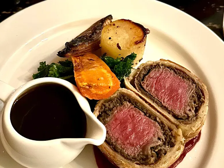비프 웰링턴은 페이스트리 빵 안에 뒥셀(Duxelles: 버섯과 양파를 버터에 볶은 것)과 안심을 넣어 오븐에 구운 영국 전통 요리예요. 오랜 시간이 소요되고 손이 많이 가는 요리라서 가격대는 조금 있지만, 입 안에 넣자마자 녹아 없어지는 소고기와 버섯의 풍미, 그리고 바삭한 페이스트리가 너무 잘 어울려 안 먹어본 사람은 있어도 한 번만 먹은 사람은 없다고 할 정도로 고급스러운 음식입니다!