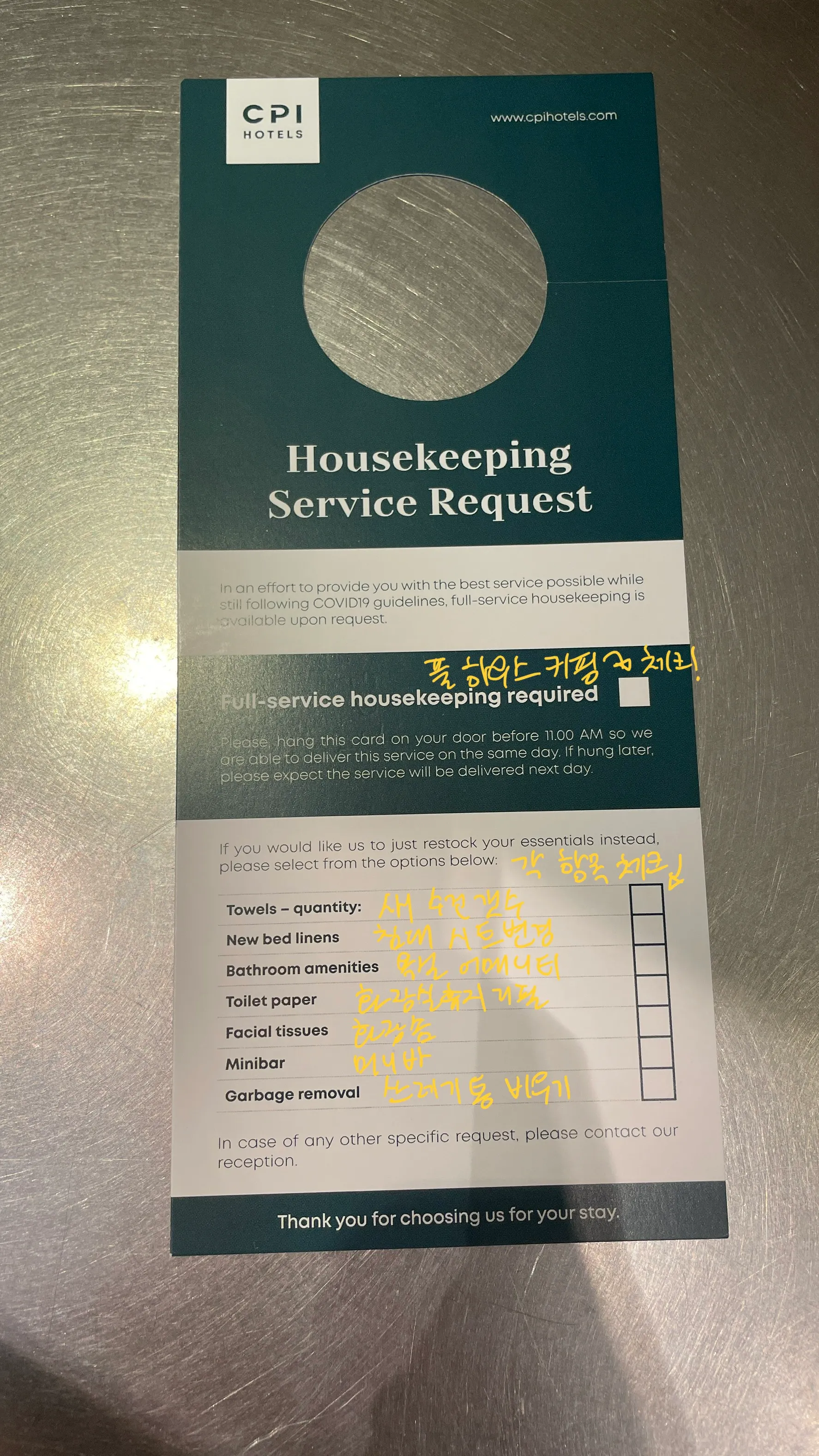아래 카드에 원하는 서비스를 체크해서 문고리에 걸어놓으면 됩니다 :)