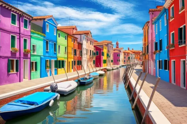 알록달록한 색의 집들이 늘어서 있는 섬 부라노는 ‘이탈리아’ 하면 떠오르는 고전적 이미지를 무색하게 만드는 곳이에요. 부라노가 이런 모습을 가지게 된 것은 어부들이 바다에서 돌아올 때 자신의 집을 한눈에 찾아볼 수 있게 다양한 색을 칠했다는 설 또는 어촌 마을이라 안개가 끼거나 흐린 날에 자신의 집을 찾기가 힘들어 선명한 색으로 칠했다는 설이 가장 유력하답니다. 지금은 정부의 담당 부서에서 허락한 색상으로만 칠할 수 있다고 해요.