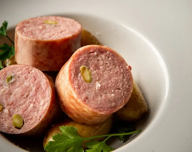 ๋ฆฌ์น์ ์์์ก์ ์๋ ๊ณ ๊ธฐ(๋ฒ ์ด์ปจ)๋ฅผ ์์ด ๋ง๋  ์์์ง์์ด์. ์ฒ์์๋ ๋น๋๊ท๋ ๋ง๊ณ ๊ธฐ๋ฅผ ์ฌ์ฉํด ๋ง๋ค์๊ณ , ์ค๋๋ ์๋ ์ ๊ณ ๊ธฐ์ ์ด์ฝ๊ธฐ(ํ, ์ด๊นจ ๋ฑ)๋ฅผ ์ฒจ๊ฐํด์ ๋ง๋ค๊ณ  ์์ฃ . ๋ณดํต ์ง๋ฐฉ์ด ์ ์ ์์์ง(์ง๋ฐฉ์ด 10~12%์ ๋ถ๊ณผํจ)๋ก, ์ฌ์ฉ๋๋ ๋ฒ ์ด์ปจ ๋ํ ์ง๋ฐฉ์ด ์ ์ ๋ฒ ์ด์ปจ๋ง ์ฌ์ฉํ๊ณ  ์๋ต๋๋ค.