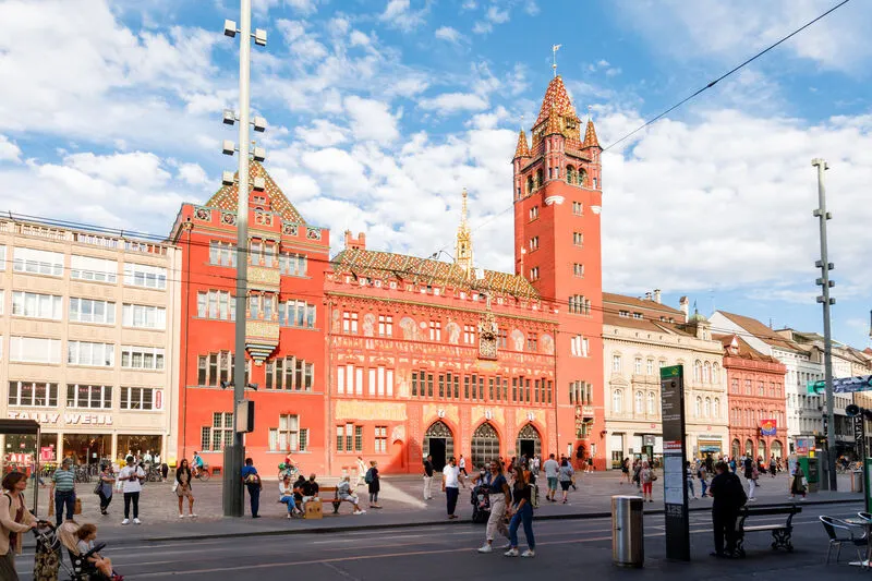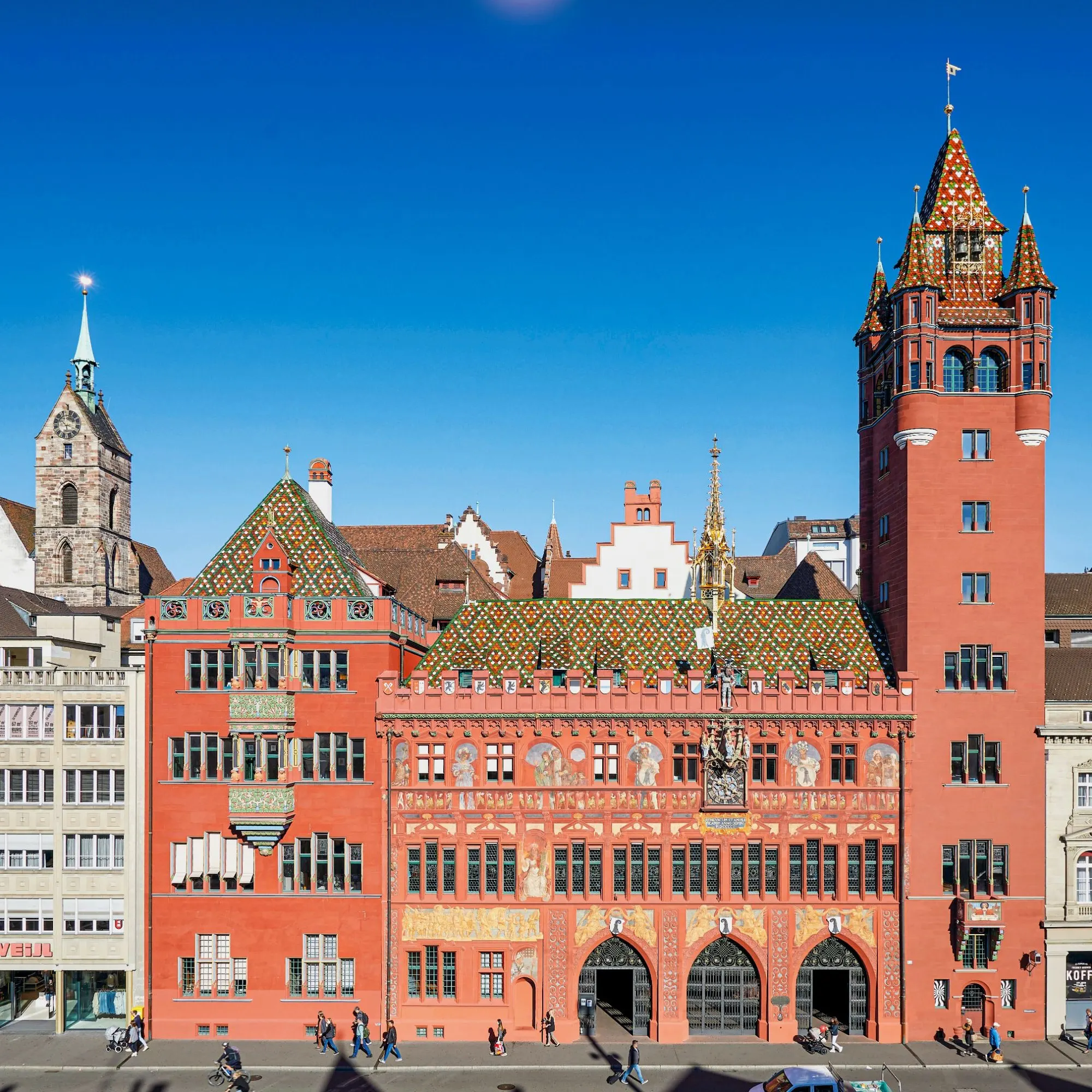 광장 중앙에 붉은 사암으로 지어진 화려한 건물은 바젤 시청사입니다. 500년 넘는 시간 동안 지금의 자리를 지키고 있는 바젤 시청사는 16세기 초(1504~1514년)에 처음 지어졌으며, 17세기 초와 1900년대 초에 확장되어 지금의 모습을 갖췄다고 해요.