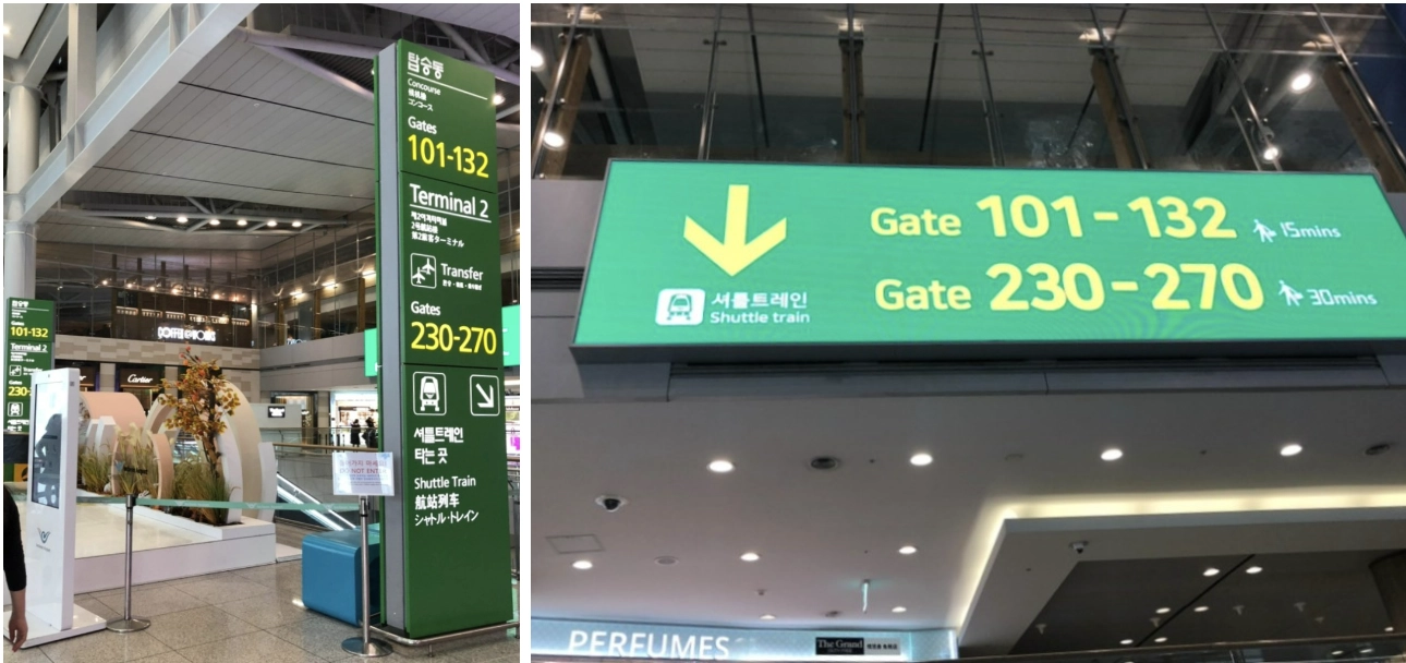 1터미널 이용 시 셔틀 트레인을 타고 이동해야 하는 게이트일 경우, 이동 시간이 더 오래 걸리니까 출국장에 도착하면 바로 셔틀을 타고 게이트 앞으로!
