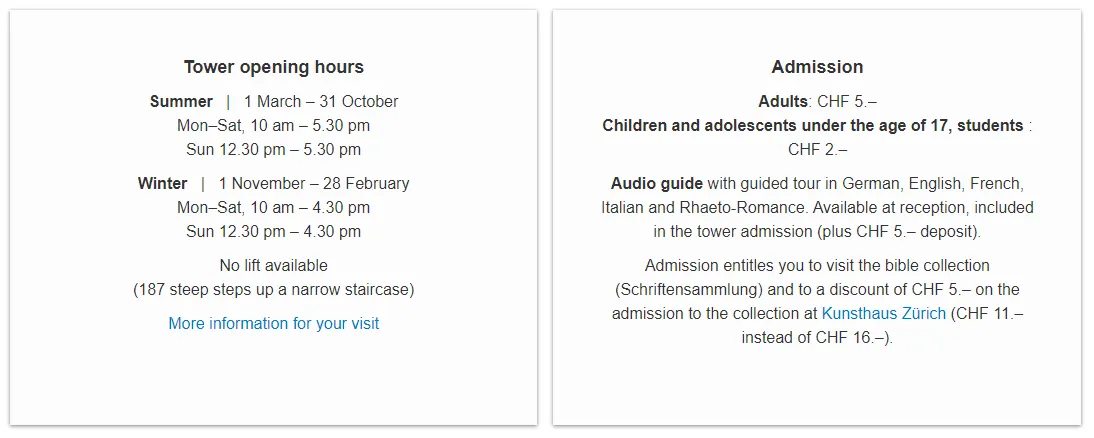 그로스뮌스터는 1519년 시작된 '츠빙글리(Huldrych Zwingli)의 스위스 종교개혁이 시작된 곳으로, 두 개의 쌍둥이 종탑을 가진 대표 중세 건축물 중 하나입니다. 종탑에 들어가 187개의 계단을 오르면 취리히 시내 전경과 호수, 그리고 알프스까지 조망할 수 있어요! 다만, 5프랑의 별도의 입장료가 필요합니다.