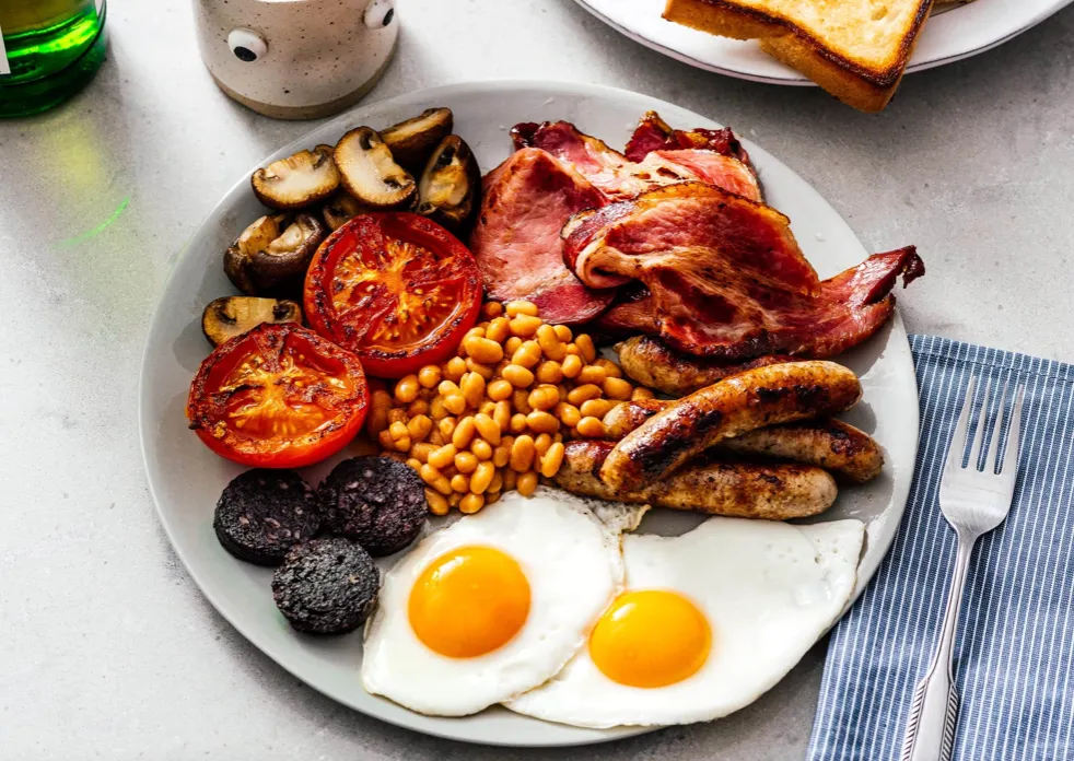 잉글리시 브렉퍼스트(English Breakfast)라고도 알려진 영국의 전통적인 아침 식사 메뉴로, 베이컨, 소시지, 달걀, 블랙 푸딩, 구운 콩, 감자, 토마토, 버섯, 토스트로 구성되며, 영국과 아일랜드에서는 카페나 펍에서 ‘하루 종일 아침 식사’라는 이름으로 제공해요.