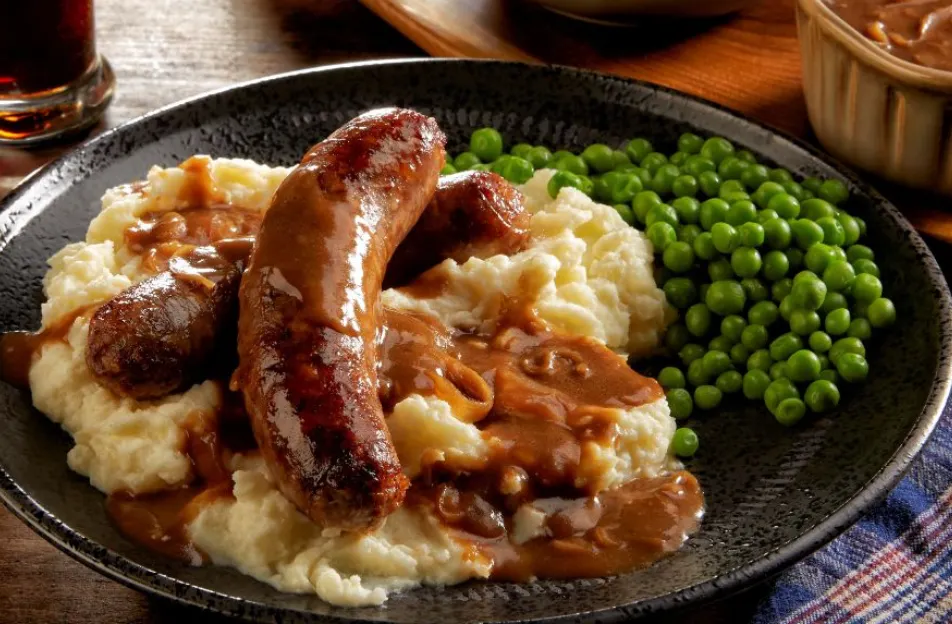 뱅어 앤 매시는 소시지와 으깬 감자로 구성된 영국의 전통 음식이에요. 보통 양파 그레이비 소스와 함께 제공되며, 때로는 튀긴 양파와 완두콩이 함께 나오기도 해요.