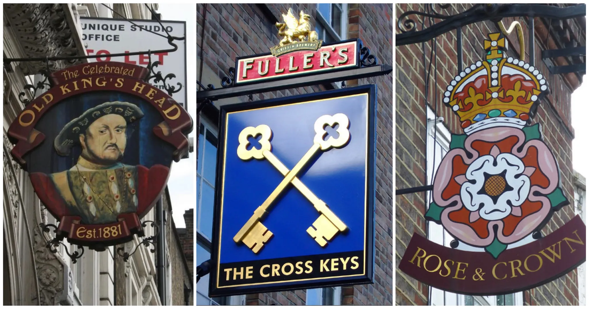 종교개혁 이전의 펍은 ‘The Crossed Keys(십자가를 두른 열쇠)’처럼 종교적 의미를 가진 이름을 가지고 있었어요. 헨리 8세의 종교개혁 이후에는 ‘The King’s Head(왕의 머리)’ 혹은 ‘The Rose & Crown(장미와 왕관)’ 등의 왕에 대한 충성을 맹세하는 이름으로 바뀌었지요.