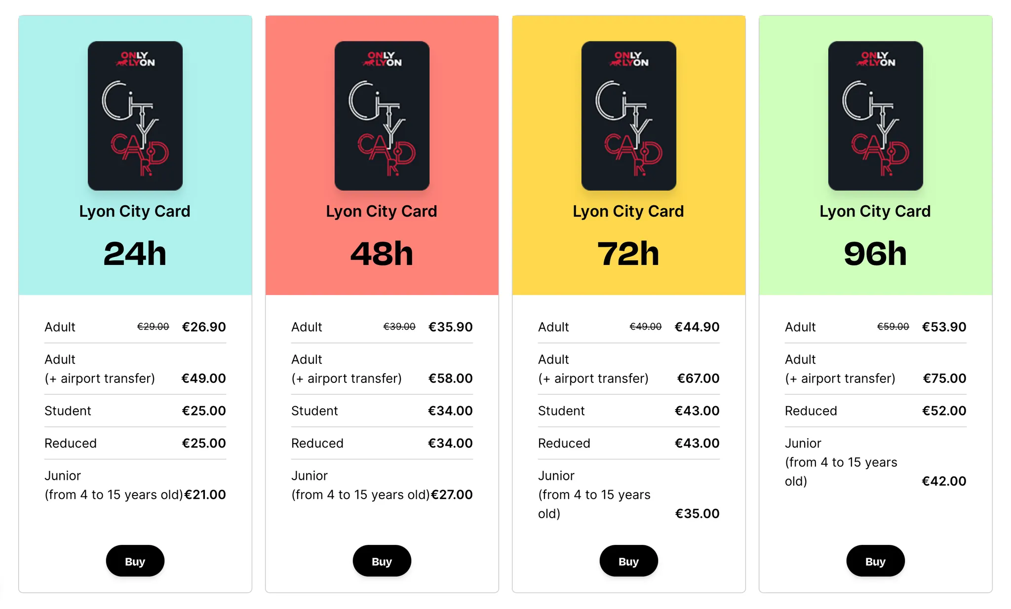 *공식 웹사이트와 관광 안내소, 리옹의 미술관이나 박물관 티켓 오피스, 제휴된 일부 호텔에서 구입 가능합니다.