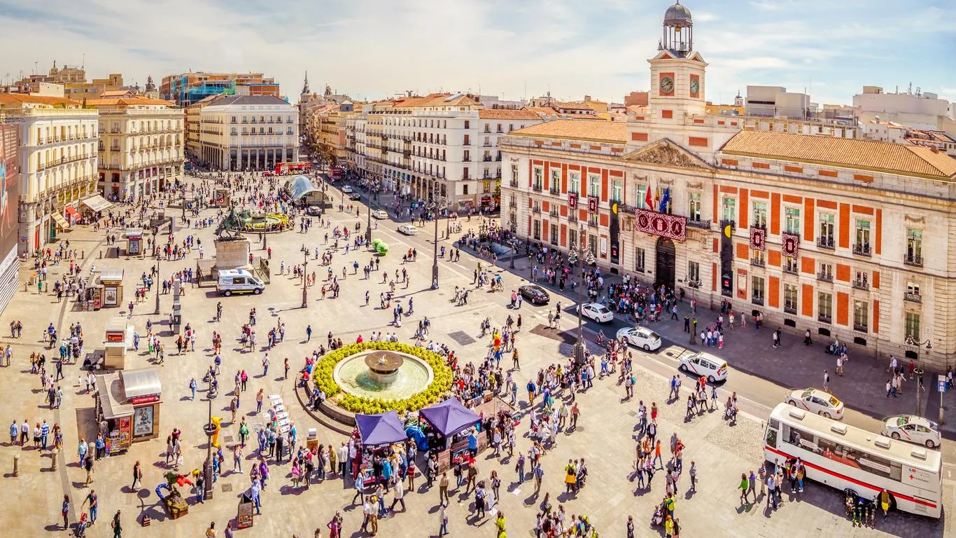 마드리드 여행의 중심인 '태양의 문', 솔 광장이에요! 광장 한 가운데의 바닥에는 마드리드의 정중앙이자 교통의 중심이 되는 ‘제로 포인트’를 밟고 지나가면 다시 마드리드로 돌아올 수 있다는 전설이 있어 많은 여행객이 찾는답니다!