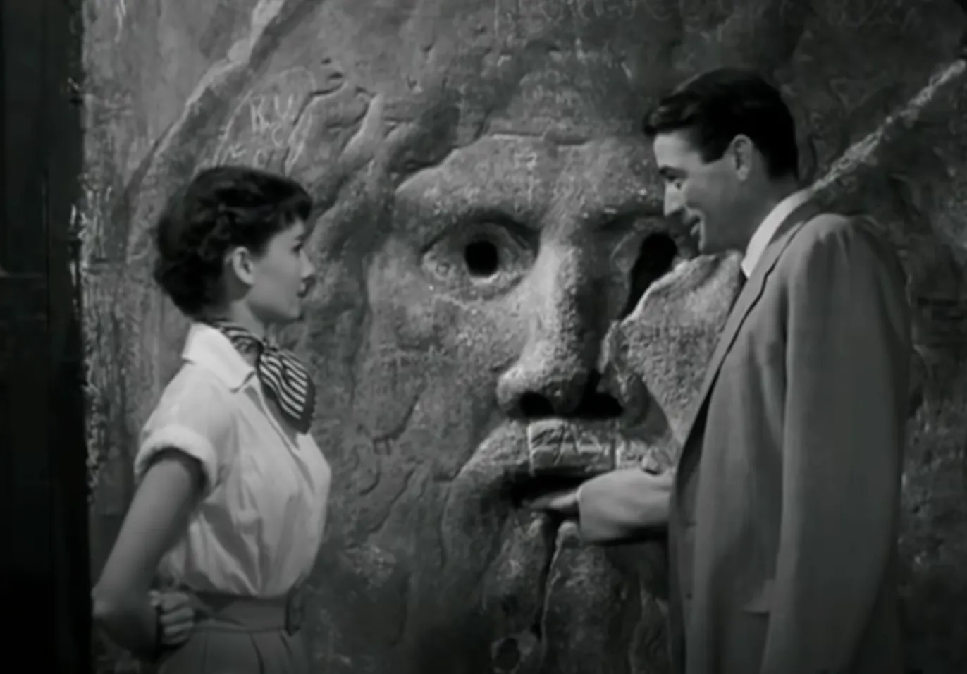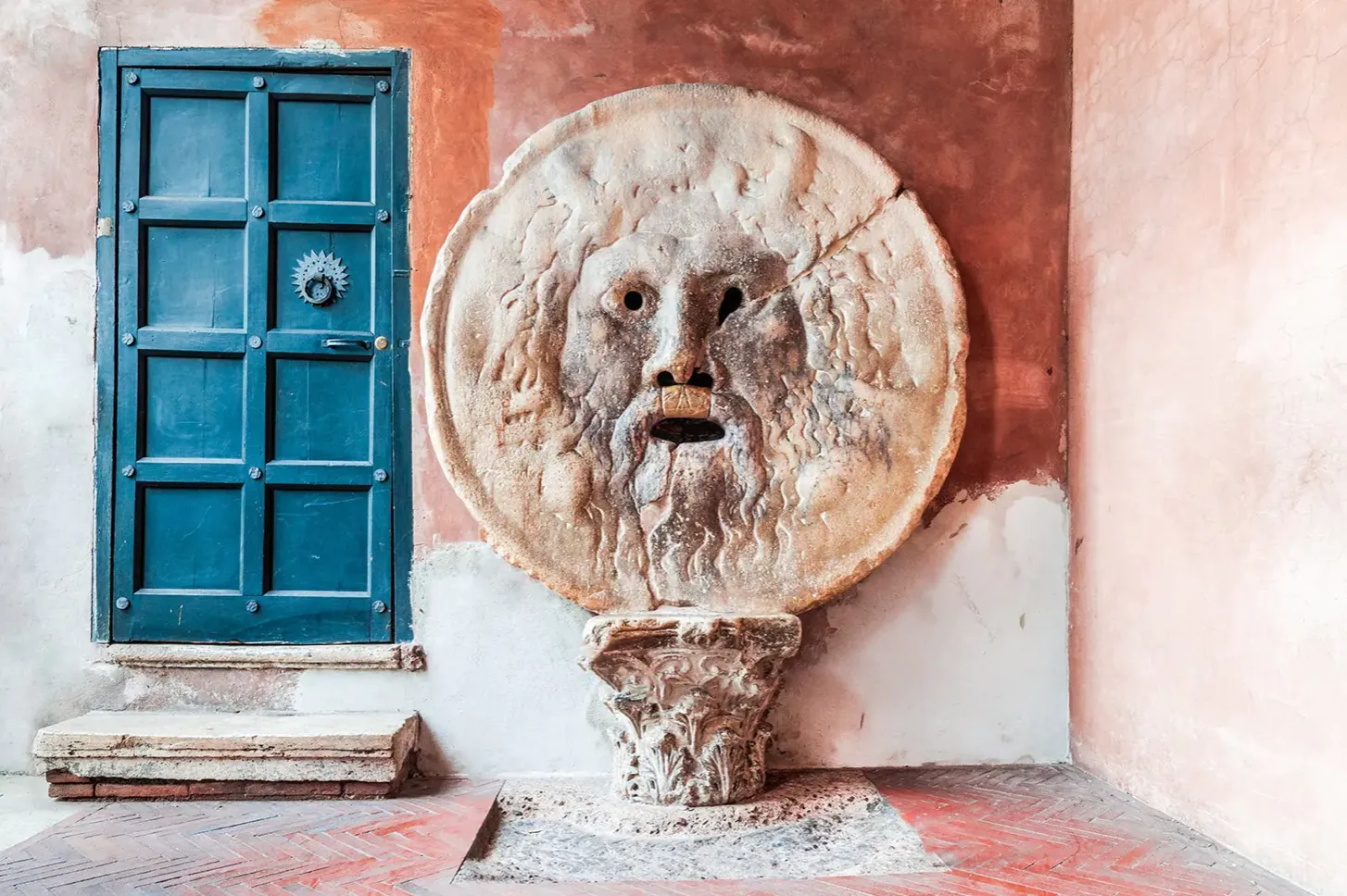 <로마의 휴일> 덕분에 세계적으로 유명해진 진실의 입은, 입에 손을 넣고 거짓말을 하면 물어서 삼킨다, 손목이 잘린다는 전설이 있어요. 이는 영화 속에서 남자 주인공 그레고리 펙이 오드리 헵번의 캐릭터에게 말해주는 전설이기도 하죠. 두 사람은 처음에 서로 솔직하지 않았기 때문에 이 장면은 영화에서 중요한 비중을 차지해요. 그레고리 펙이 손이 '삼켜진' 것처럼 연기하며 재킷 소매에 손을 숨긴 채로 '팔뚝'을 꺼내서 오드리 헵번에게 장난을 치는 장면이죠!