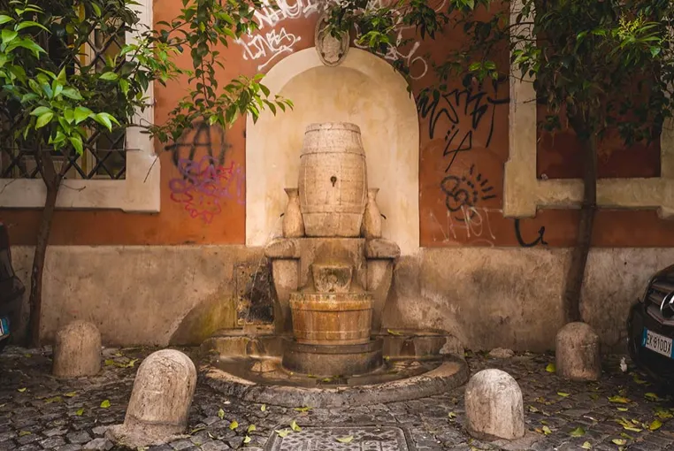 1927년에 지어진, 이 지역의 오랜 와인 상업 역사를 보여주는 분수에요. 와인 통과 로마인들이 흔히 '콰르티니'라고 부르는 통 측면의 두 개의 용기를 포함하여 와인의 생산과 소비에 필요한 요소들을 볼 수 있어요. 길모퉁이에 있어서 그냥 지나치기 쉬우니 잘 찾아보세요!
